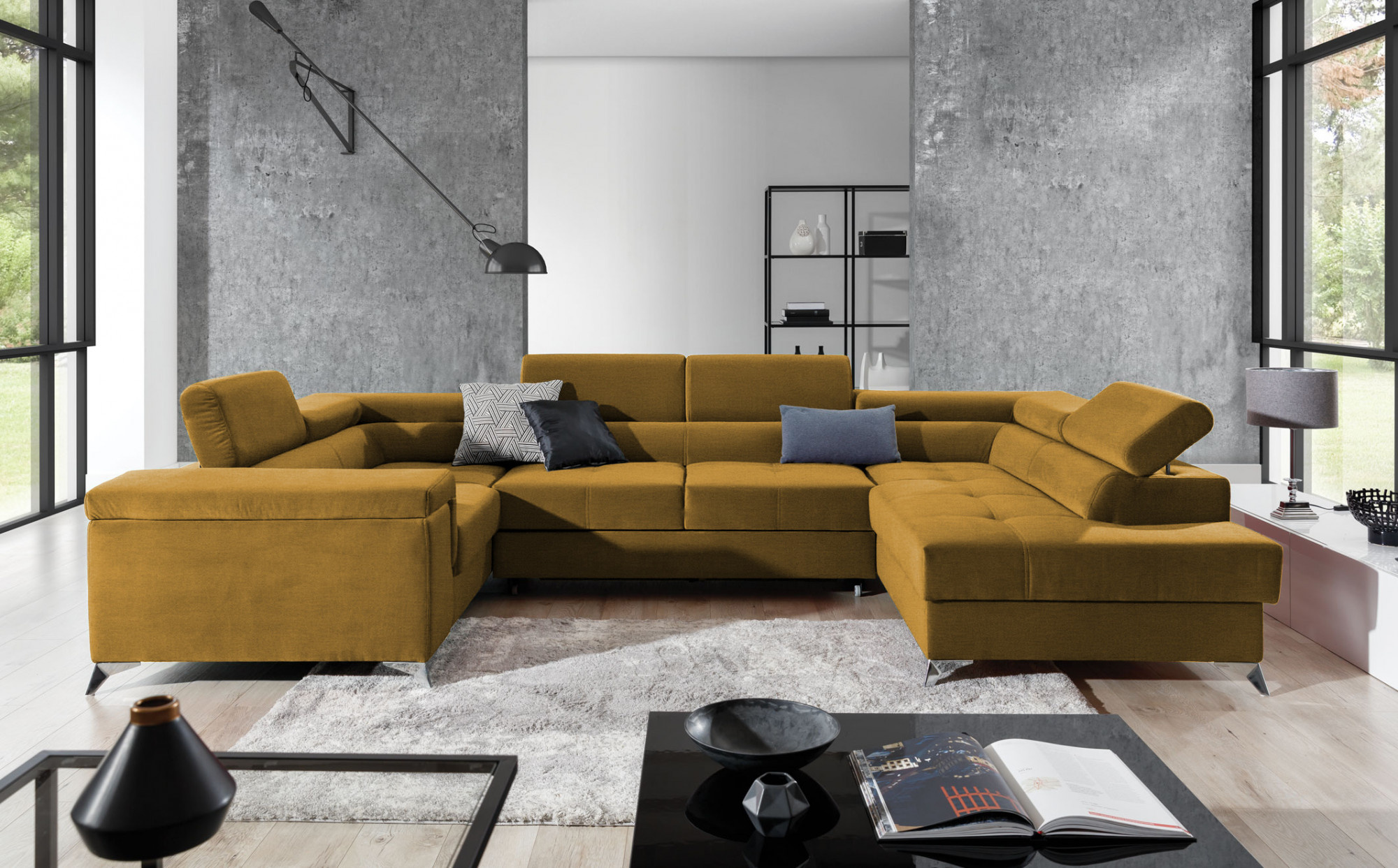 Thiago je multifunkčný, elegantný a priestranný rohový gauč v tvare U, ktorý môže byť luxusným zakončením každej obývačky. Jedná sa o vysoko kvalitný kus nábytku, synonymum pohodlia a elegancie, okrem iného vďaka inovatívnej HR pene, ktorá zvyšuje pružnosť a odolnosť sedadla. Za Thiagom s rozmermi 350 x 202 x 90 cm sa neskrýva len pohodlie, ale aj dobre prespané noci vďaka veľkej spacie ploche. Skladací typ mechanizmu delfín vám umožňuje ľahko a bez námahy rozložiť pohovku, ktorá má tvar priestrannej postele s rozmermi 125 x 265 cm. Okrem toho je naša rohová pohovka tiež vybavená praktickým a priestranným úložným priestorom na posteľnú bielizeň, ktorý sa nachádza v otomane.Medzi vlastnosti tohto modelu môžeme zahrnúť širokú opierku rúk, čalúnené operadlo, nastaviteľné opierky hlavy, dekoratívny vankúš v cene, rovnako ako množstvo variantov v bohatých farbách. Ak ste zvedaví, čo ďalšie náš Thiago ponúka - pozývame vás vyskúšať túto rohovú pohovku.