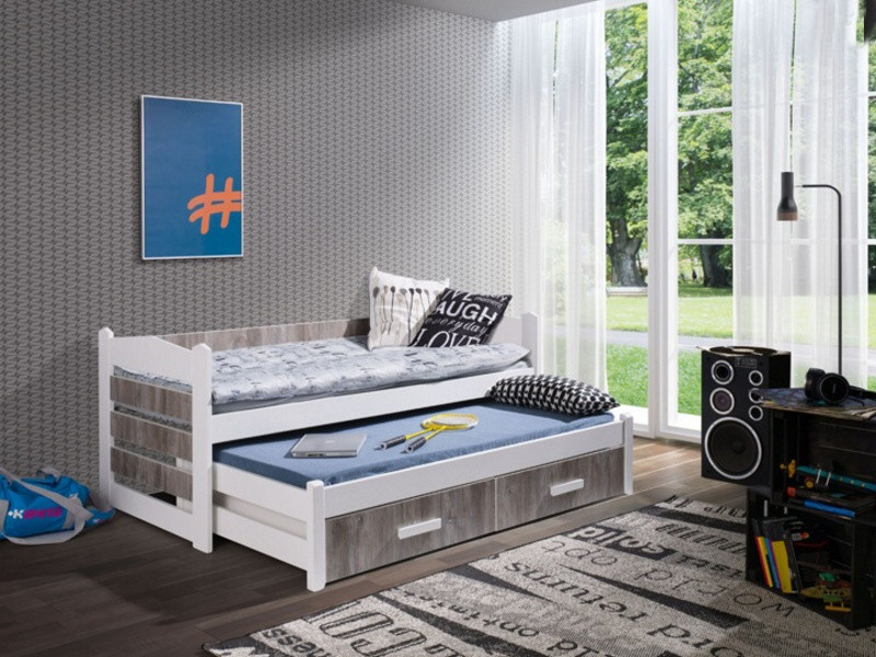 TIAGO je detská posteľ pre 2 deti - v tomto modeli bol rám postele vyrobený z borovicového dreva v bielom akryle, doplnky z farebného sivého duba. Súčasťou nie je molitanový matrac s rozmerom 180x80 cm.