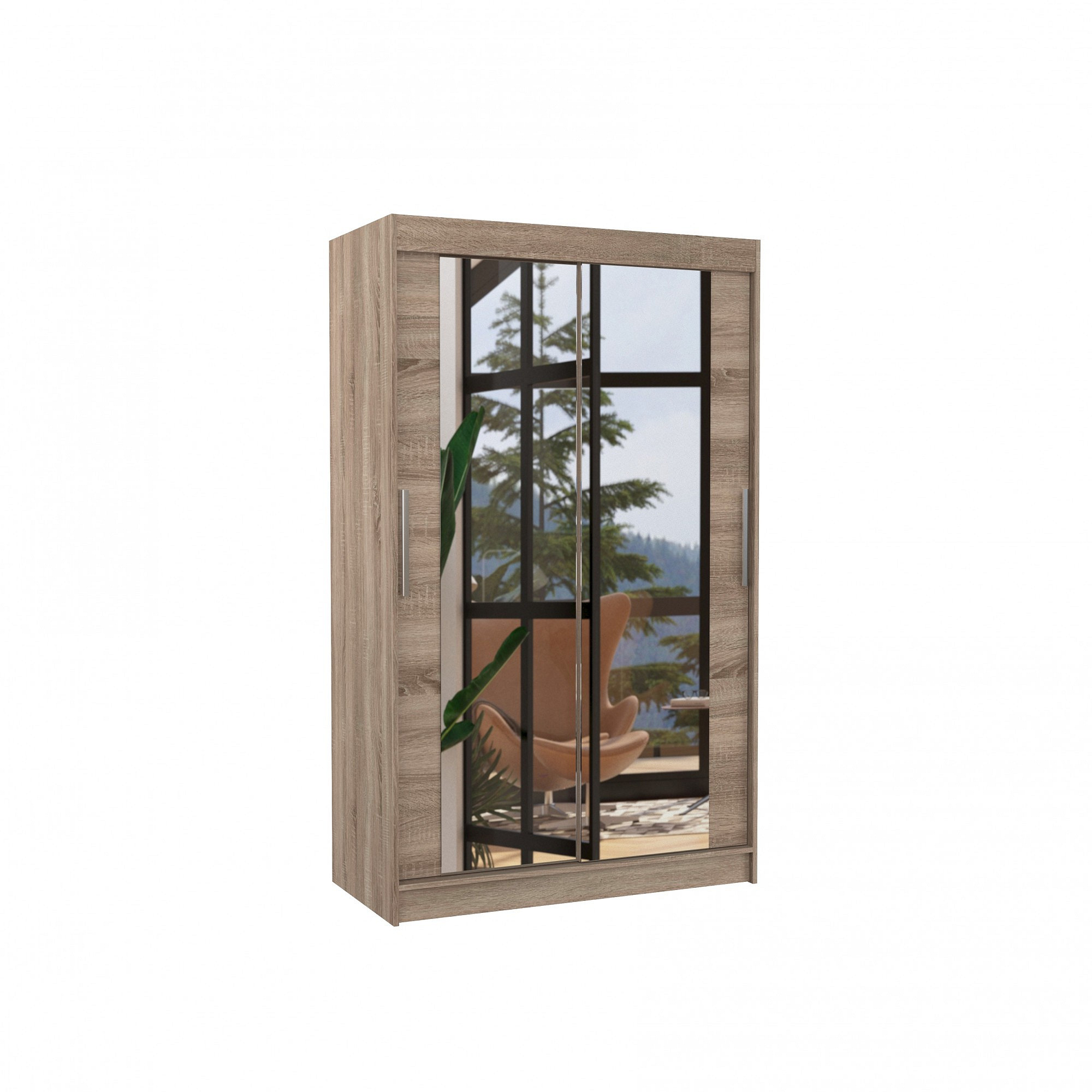 Šatní skriňa s posuvnými dverami a zrkadlom TIBAGO je ideálnym spôsobom, ako usporiadať priestor. Nábytok je vybavený priestrannými policami a tyčou, na ktorú môžete zavesiť šaty, obleky, vrchné odevy alebo košele. Na čelnú stranu boli pripevnené zrkadlá, ktoré opticky zväčšujú priestor a zároveň dodávajú jedinečný štýl. Vďaka tomu, že skriňa je posuvná, nemusíte vyčleňovať ďalšie miesto na otvorenie dverí, čo z nej robí ideálne riešenie pre malú izbu alebo úzku predsieň.