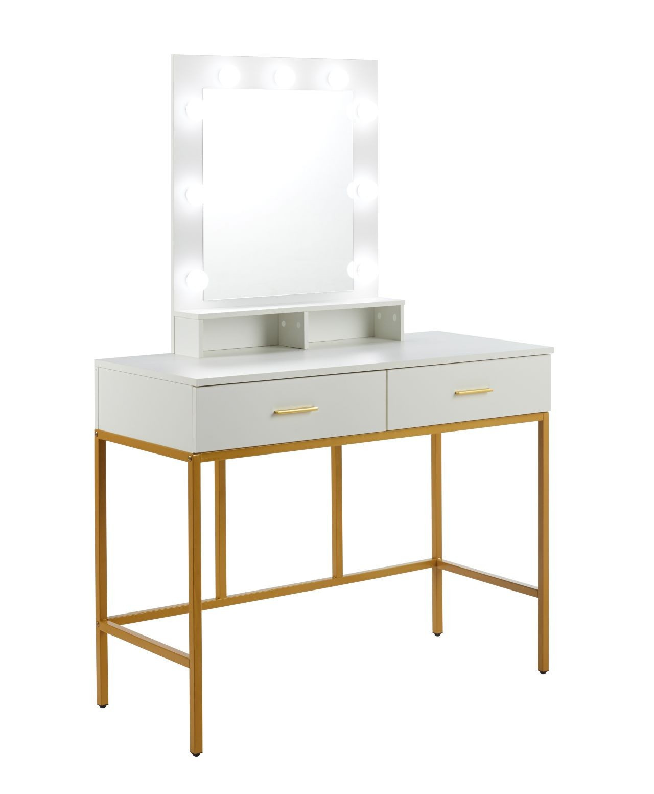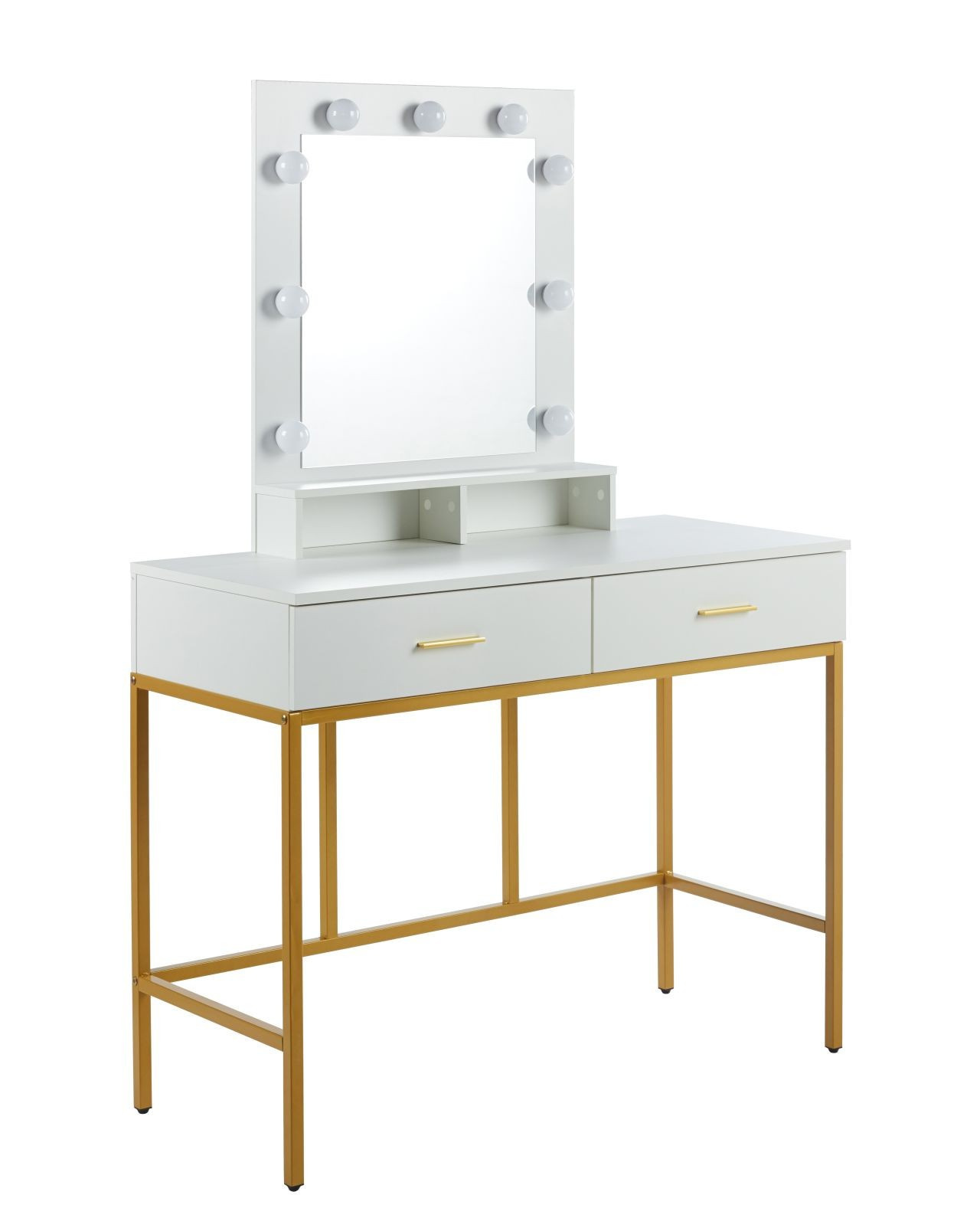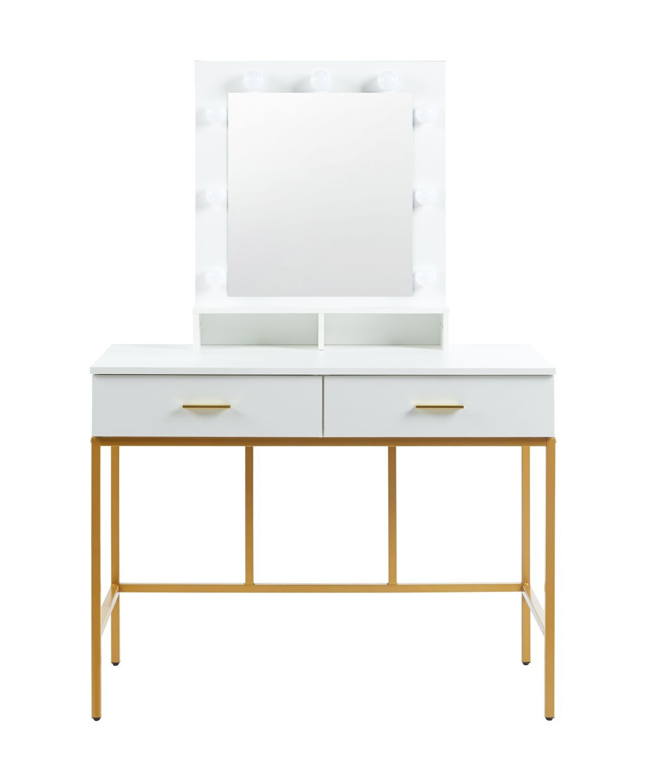 ROZMERY: - hĺbka: 45 cm - šírka: 100 cm - výška: 150 cm MATERIÁL: - doska: laminovaná drevotrieska - rám: práškovo lakovaný kov FARBA: - doska: biela - rám: zlatý OSTATNÉ: - LED osvetlenie - zrkadlo - dve zásuvky