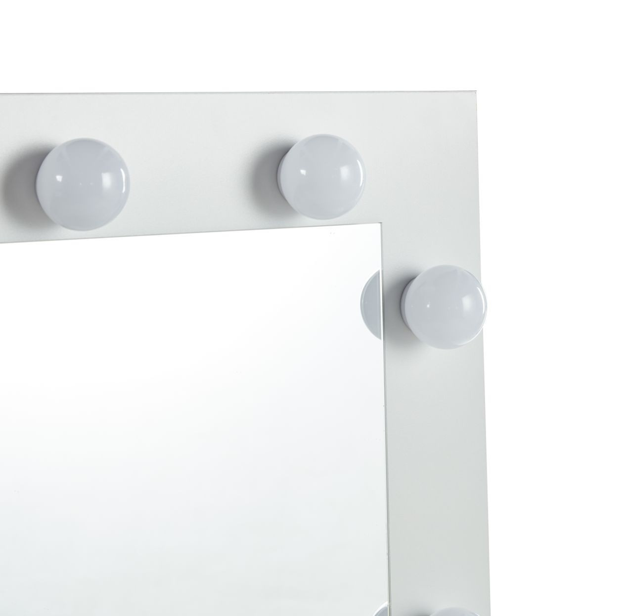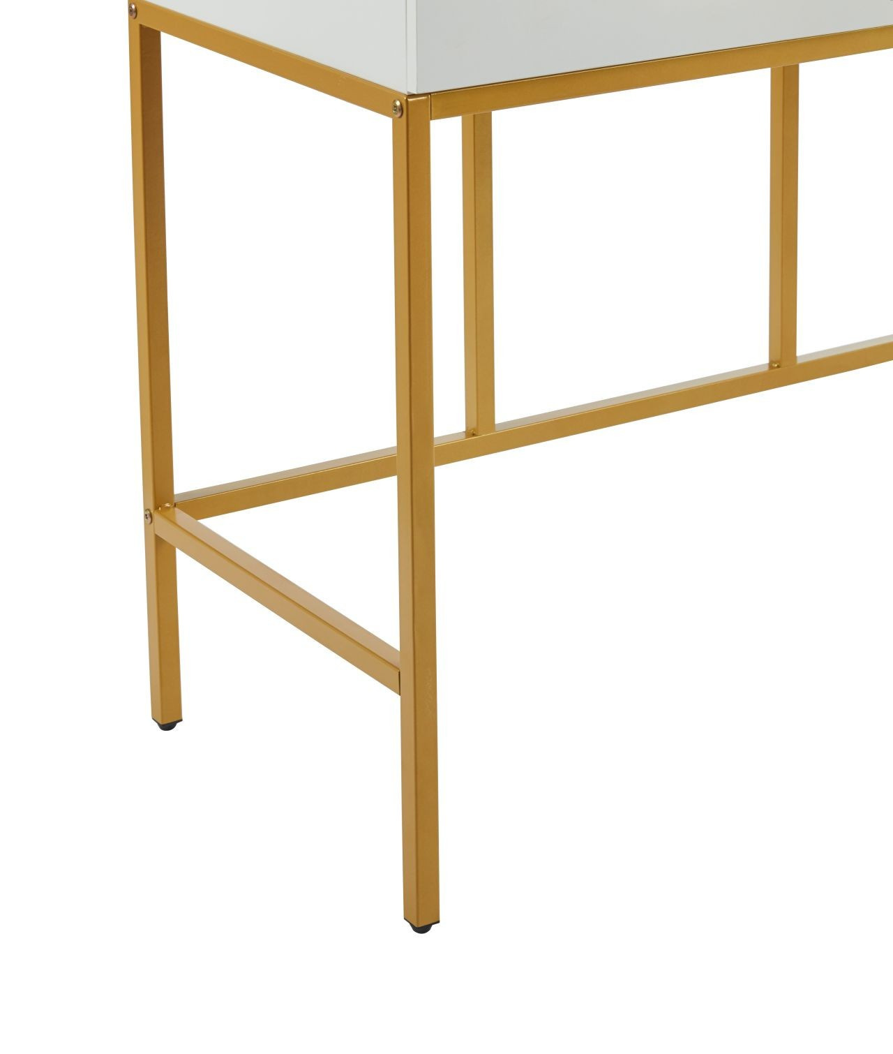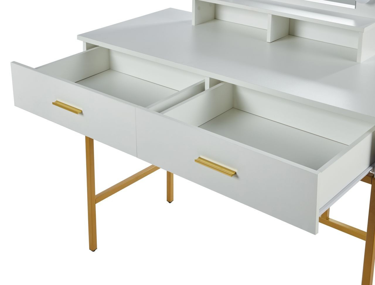ROZMERY: - hĺbka: 45 cm - šírka: 100 cm - výška: 150 cm MATERIÁL: - doska: laminovaná drevotrieska - rám: práškovo lakovaný kov FARBA: - doska: biela - rám: zlatý OSTATNÉ: - LED osvetlenie - zrkadlo - dve zásuvky