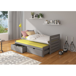 Dvojitá posteľ TOMI je ideálnym riešením v izbe pre dvoch súrodencov. Dokonale sa osvedčí aj v prípade návštevy nečakaných hostí. Model je dostupný v dvoch veľkostiach a v mnohých farbách, ktoré sa hodia do každého usporiadania. Posteľ má dve praktické a funkčné zásuvky na posteľnú bielizeň a odolný a pevný rám vyrobený z borovicového dreva. Spolu s posteľou obdržíš sadu penových matracov o hrúbke 8 cm.