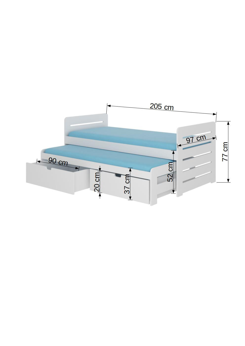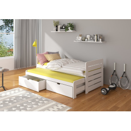 Dvojitá posteľ TOMI je ideálnym riešením v izbe pre dvoch súrodencov. Dokonale sa osvedčí aj v prípade návštevy nečakaných hostí. Model je dostupný v dvoch veľkostiach a v mnohých farbách, ktoré sa hodia do každého usporiadania. Posteľ má dve praktické a funkčné zásuvky na posteľnú bielizeň a odolný a pevný rám vyrobený z borovicového dreva. Spolu s posteľou obdržíš sadu penových matracov o hrúbke 8 cm.
