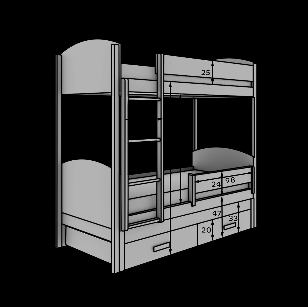 Detská posteľ Leia je funkčné riešenie, ktoré pojme tri deti. Jeho konštrukcia sa skladá z dvoch poschodí a dodatočnej vysúvacej spodnej postele. Pevný rám zaisťuje stabilitu a bezpečnosť, a vstavaný rebrík umožňuje jednoduchý prístup na hornú úroveň. Ochranné zábrany na hornom lôžku zabezpečujú bezpečnosť dieťaťa počas spánku. Dodatočne je posteľ vybavená priestrannými zásuvkami, ktoré poskytujú praktické miesto na uloženie posteľnej bielizne, hračiek alebo iných detských doplnkov. Leia je kombináciou funkčnosti a moderného dizajnu, ideálna do detskej izby.