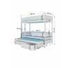 Poschodová 3-lôžková posteľ ETAPO je skvelý nápad na úsporu miesta v malej detskej izbe. Nábytok obsahuje schodíkový rebrík a dve priestranné a funkčné zásuvky na posteľnú bielizeň. Navyše na dvoch úrovniach boli namontované zábradlia zvyšujúce bezpečnosť počas spánku. Spolu s posteľou obdržíte sadu troch penových matracov s hrúbkou 8 cm.