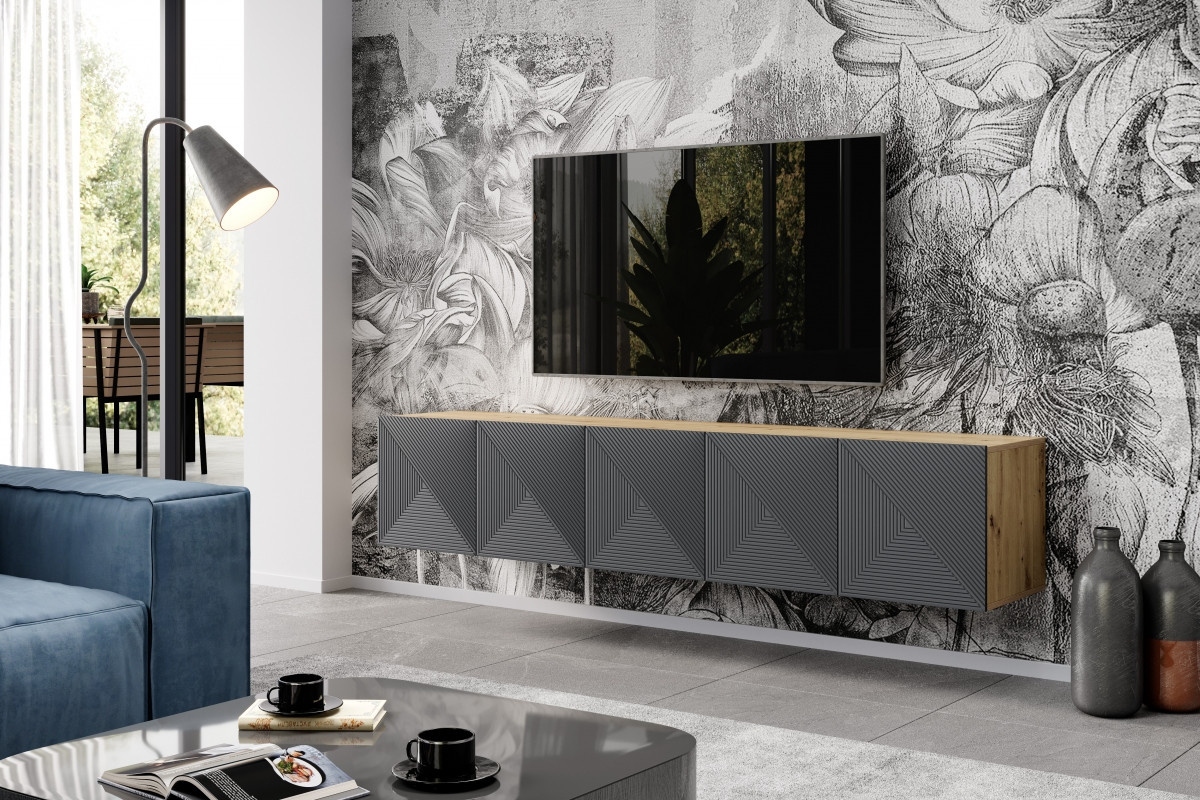 Závesná TV skrinka Asha 200 cm - remeselnícka /rivérová kamenná podložka, šírka: 200, výška: 40, hĺbka: 40, vlastná montáž. TV skrinka Asha 200 cm - remeselnícka /rivier stone mat