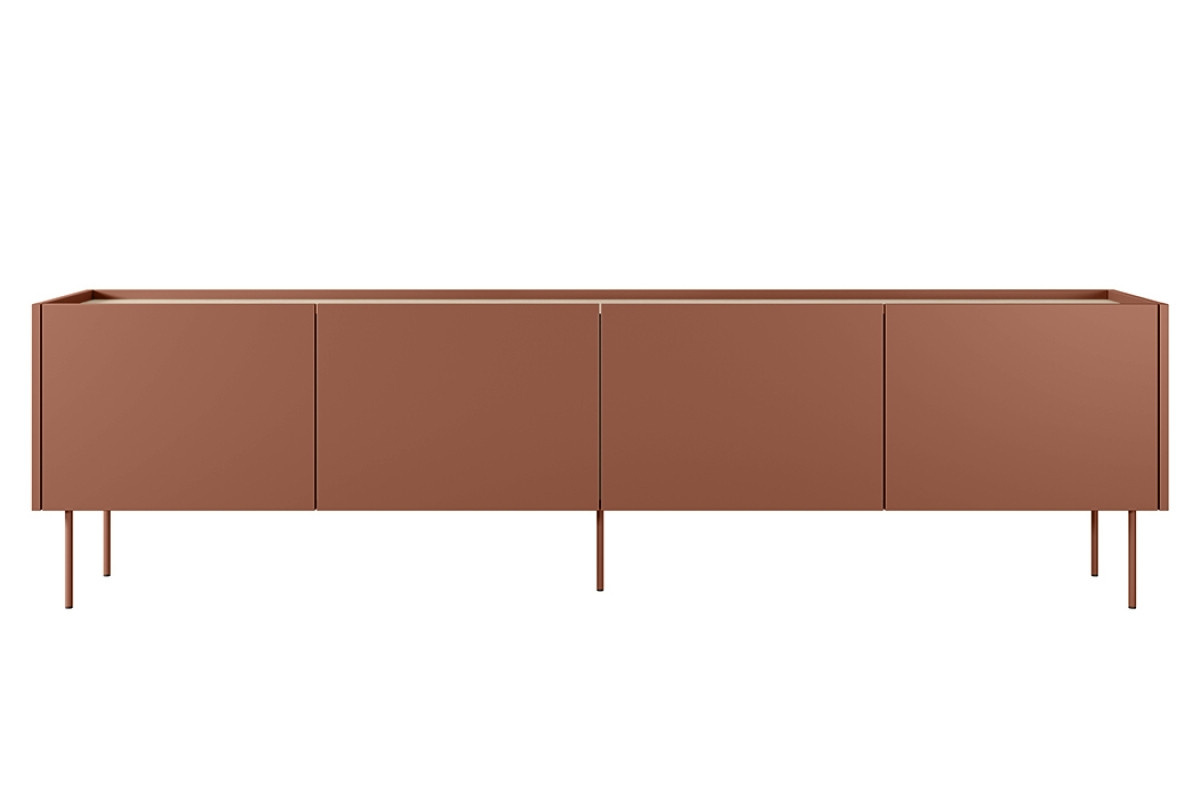Štvordverová RTV skriňa s kontajnerom Desin 220 4D1SZ - keramická červená / dub nagano, šírka: 220, výška: 60, hĺbka: 40, montáž: svojpomocne. Truhlica RTV na čiernych kovových nohách.