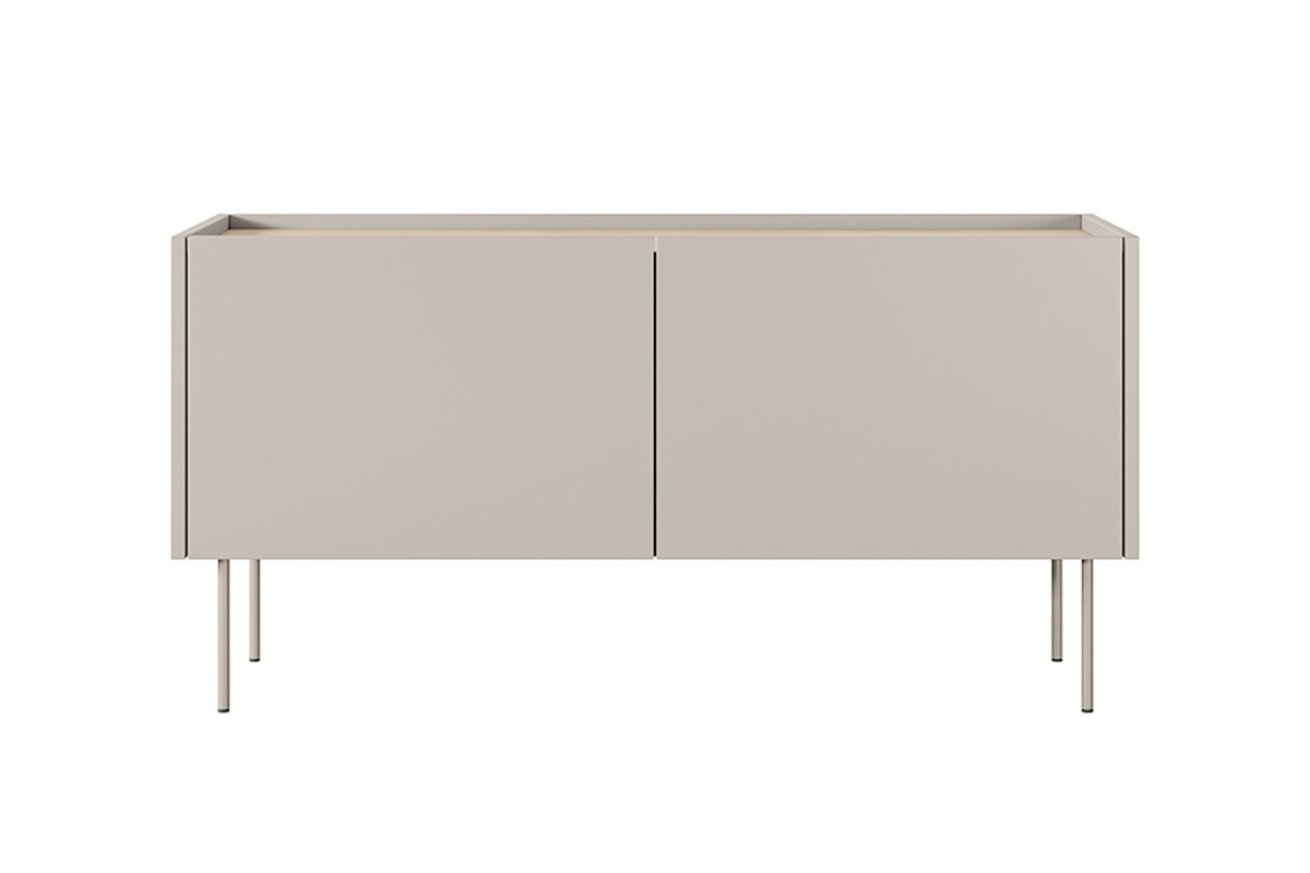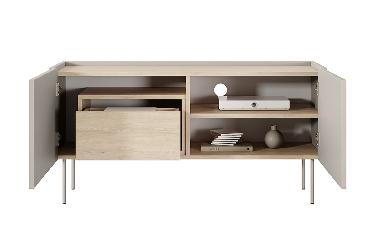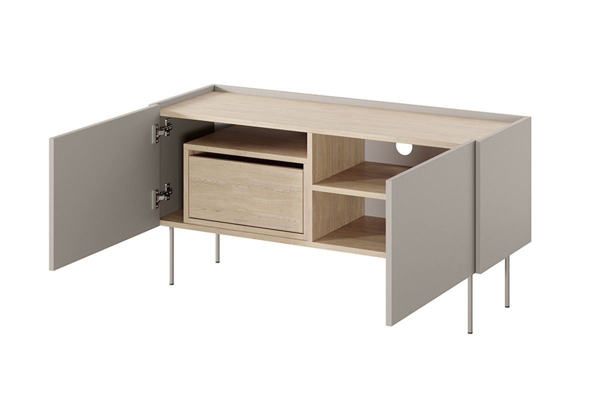 RTV skrinka s dvomi dvierkami a kontajnerom Desin 120 2D1SZ - kašmír / dub nagano, šírka: 120, výška: 60, hĺbka: 40, montáž: vlastná. Truhlica RTV na čiernych kovových nohách.
