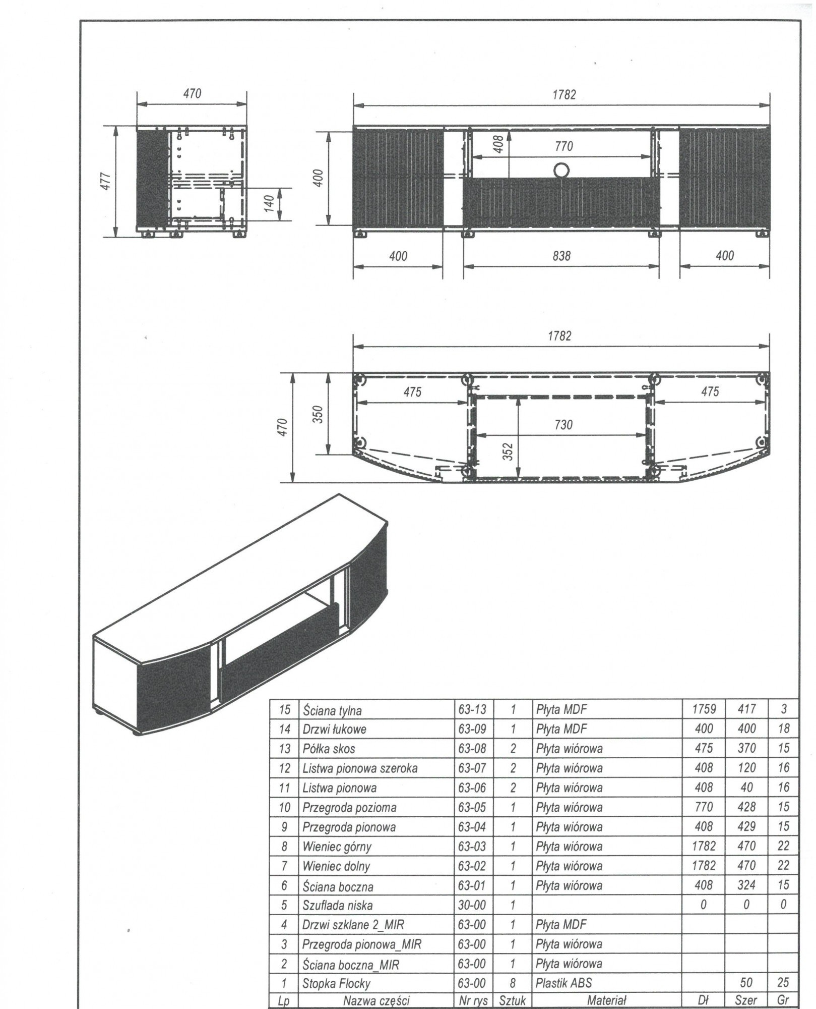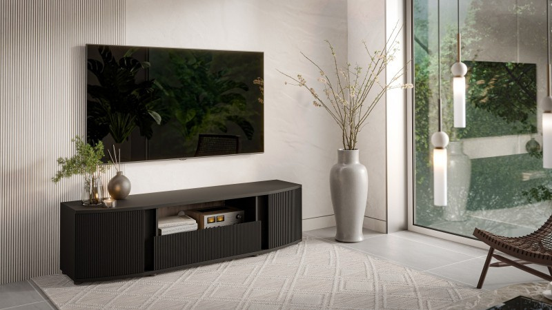 MICHELLE skrinka RTV rozmery: v/š/h: 48/178/35÷47cm materiál: Korpus: laminovaná drevotrieska 16mm Čelo: laminovaná MDF doska 16mm s viditeľnými frézami Nohy: plastové, 25mm; Úchyty: žiadne