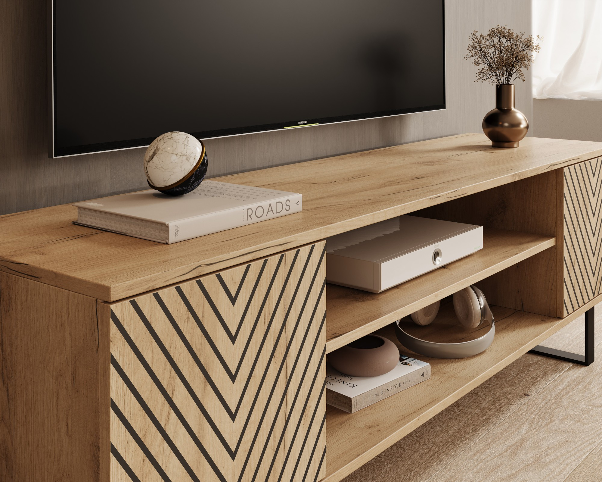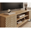 Skrinka RTV Lorello je dokonalým spojením elegancie a modernosti, ktoré vnese do vášho interiéru výnimočný charakter. Čelá zdobia jemné motívy lamiel a efektná rybia kosť, dodávajúce nábytku jedinečný štýl inšpirovaný škandinávskym a industriálnym dizajnom. Čierne, kovové nohy podčiarkujú minimalistickú estetiku, zároveň zabezpečujú stabilitu a trvanlivosť konštrukcie. Vďaka premyslenej organizácii interiéru ponúka skrinka Lorello veľa miesta na uloženie RTV zariadení, príslušenstva alebo drobností. Praktické police a zásuvky uľahčujú udržiavanie poriadku a otvory na káble zabezpečujú, že káble zostávajú neviditeľné. Skrinka RTV Lorello je ideálnou voľbou pre osoby, ktoré si cenia funkčnosť, štýl a vysokú kvalitu spracovania. Skvele sa hodí do obývacích izieb zariadených v loftovom, modernom alebo klasickom štýle s nádychom elegancie.
