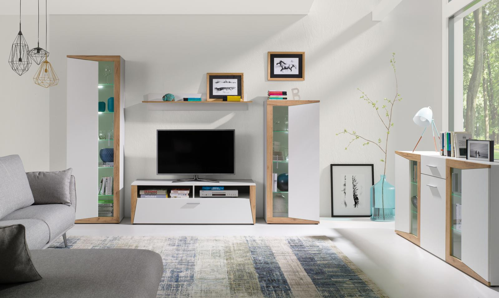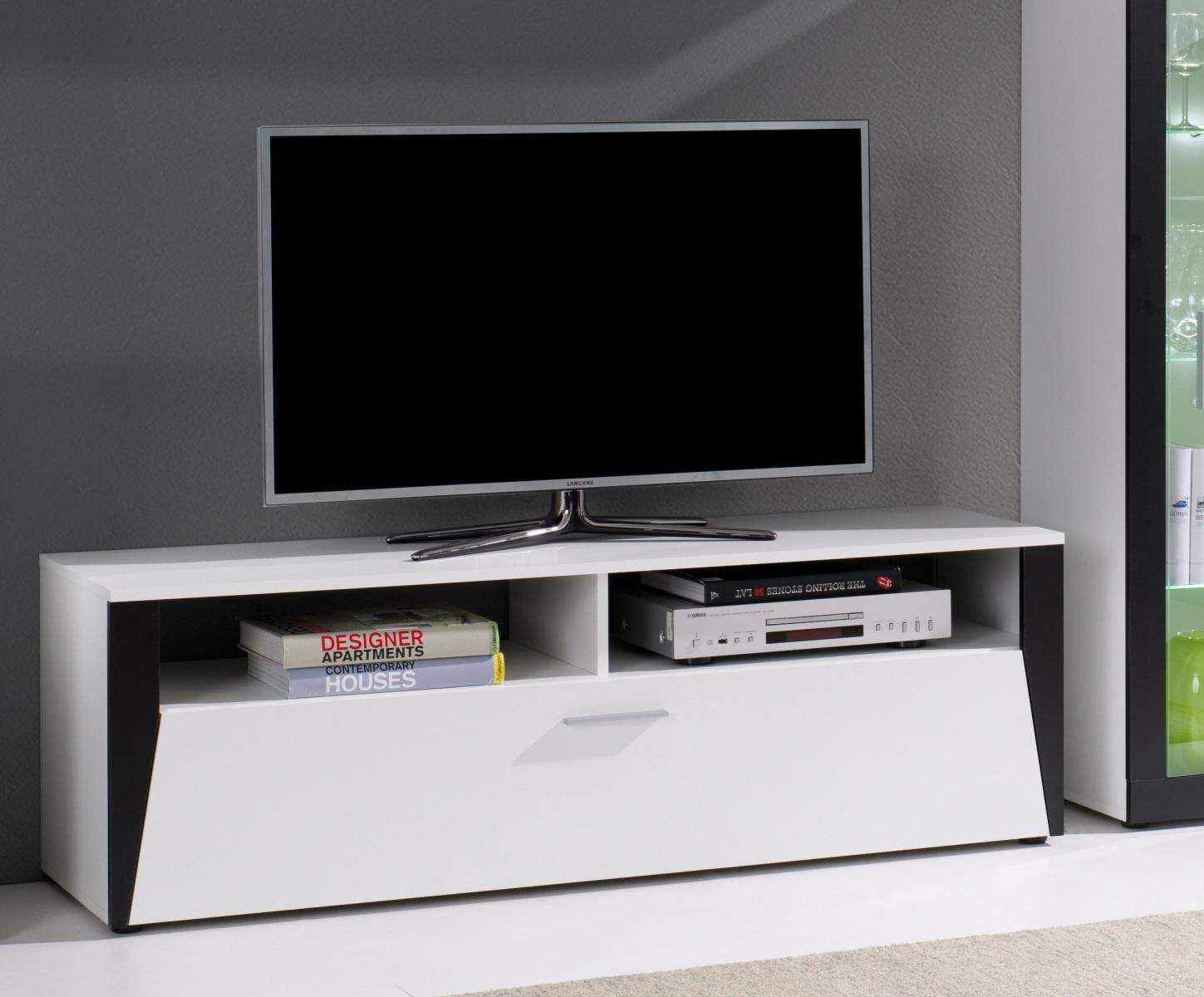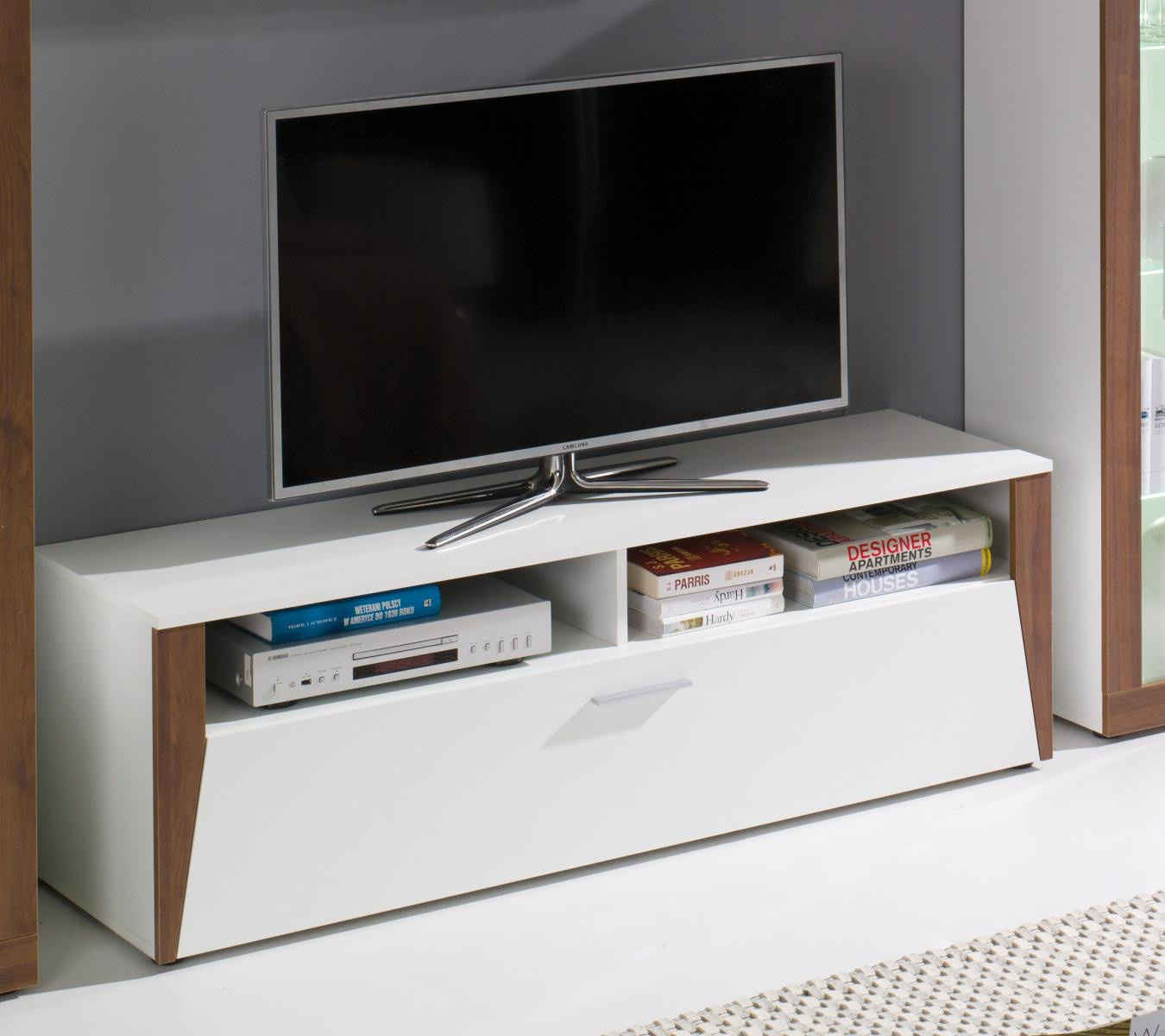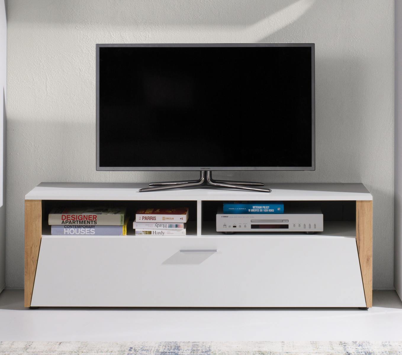 Vďaka svojim rozmerom a dizajnu ponúkaTV stolík Piass dostatok priestoru nielen pre televízor. Skvele doplní obývaciu stenu Piass, ktorú tiež nájdete v našej ponuke. Môžete si ho objednať aj samostatne a doplniť ním svoj existujúci interiér. Stôl je vyrobený z laminátu s hrúbkou 16 mm a povrchovou úpravou biely/zlatý dub, ktorý je odolný voči poškriabaniu, poškodeniu, vlhkosti a vysokým teplotám. Televízny stolík si môžete objednať v troch dekoroch: biela/zlatý dub, biela/orech, biela/čierna. Dodáva sa v demontovanom stave a obsahuje montážny plán vrátane všetkých potrebných spojovacích prvkov. Pre inšpiráciu je priložená fotografia zostavy, ktorá sa skladá z častí systému Piass. Túto súpravu nájdete aj v našej ponuke. Zobrazené dekorácie nie sú zahrnuté v cene.