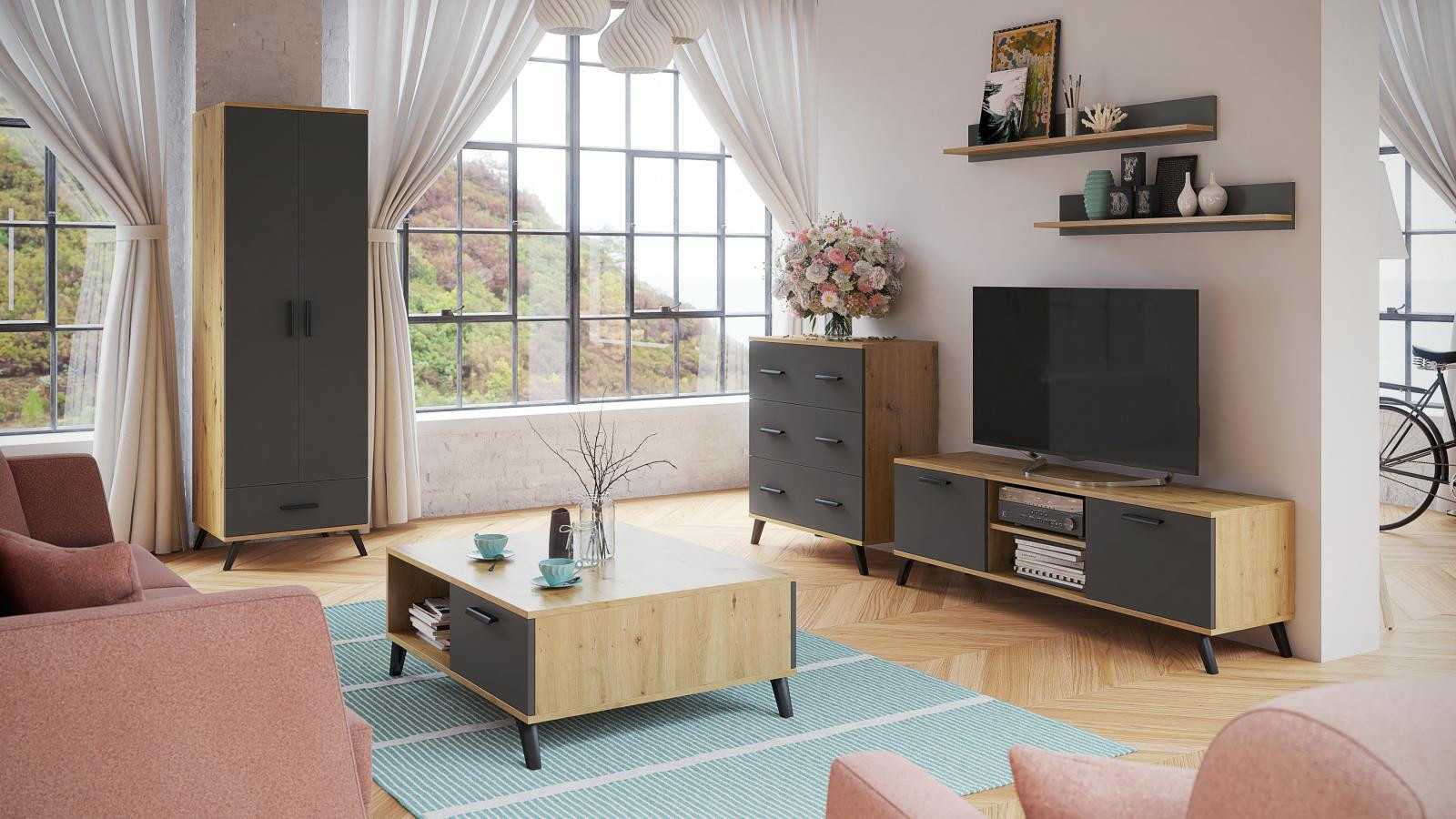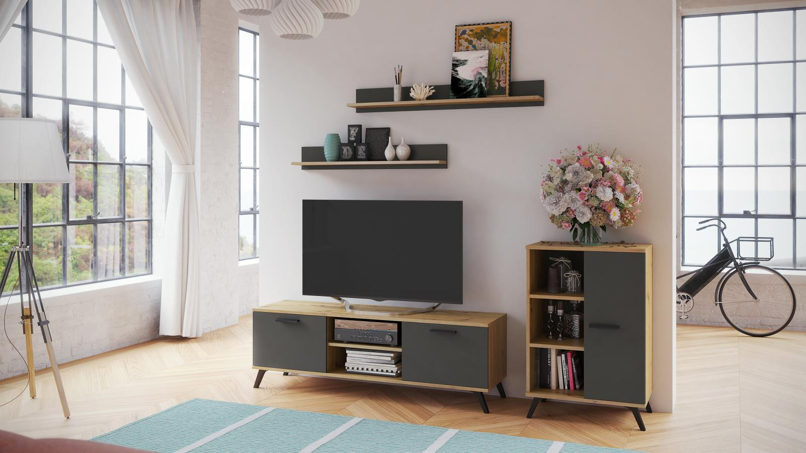 TV stolík Roky 1 Graphite je vyrobený z laminátu v krásnom dekore grafit a dub artisan. Laminát s hrúbkou 18 mm je odolný a zakončený ABS lištou. Oceníte aj jednoduchú údržbu. Televízny stolík je veľmi praktický, kombinácia dvierok a políc pojme všetko potrebné. Rukoväte v dekore dreva sú vyrobené z plastu. Dodáva sa v demontovanom stave. Montážny návod vrátane všetkých spojovacích prvkov je súčasťou balenia.