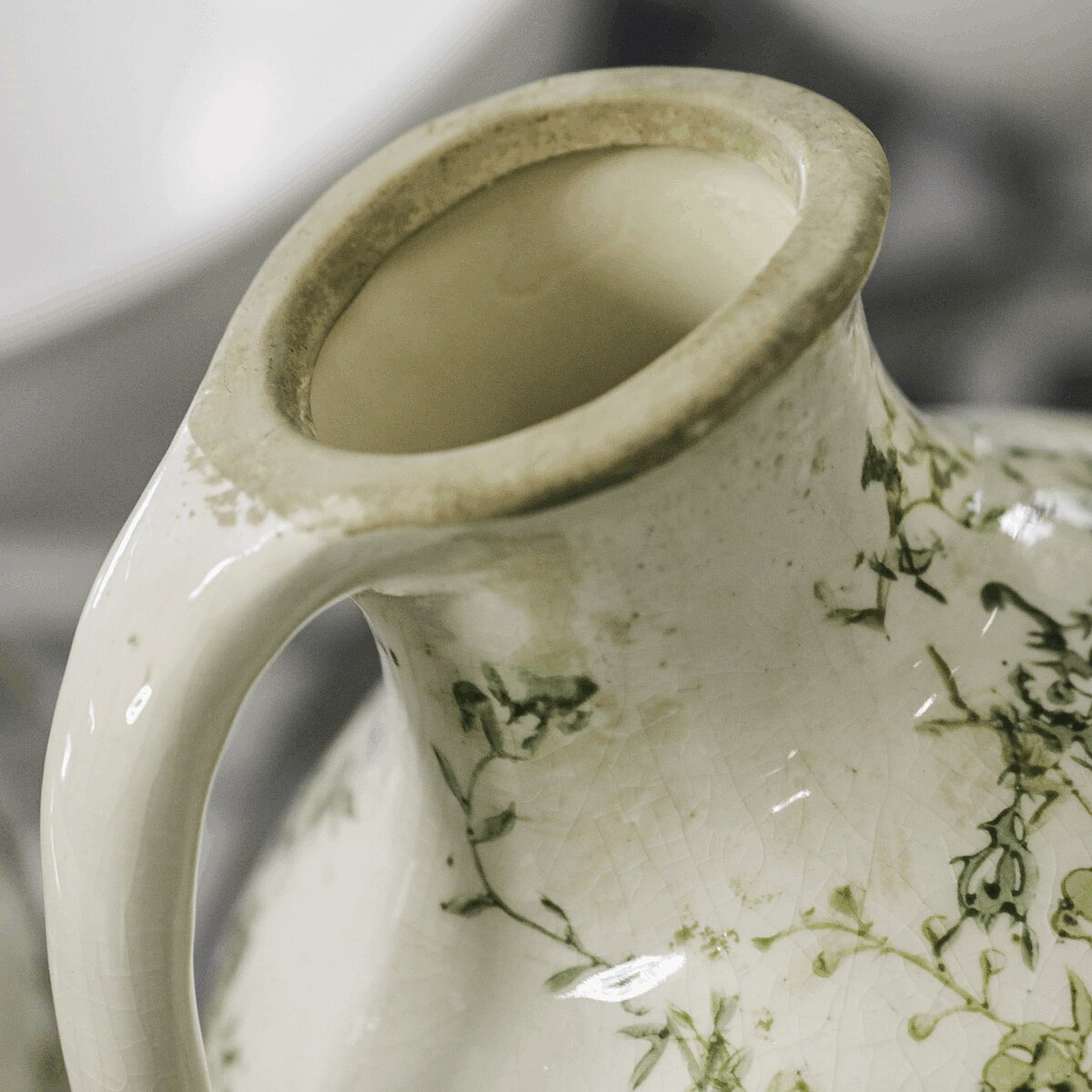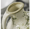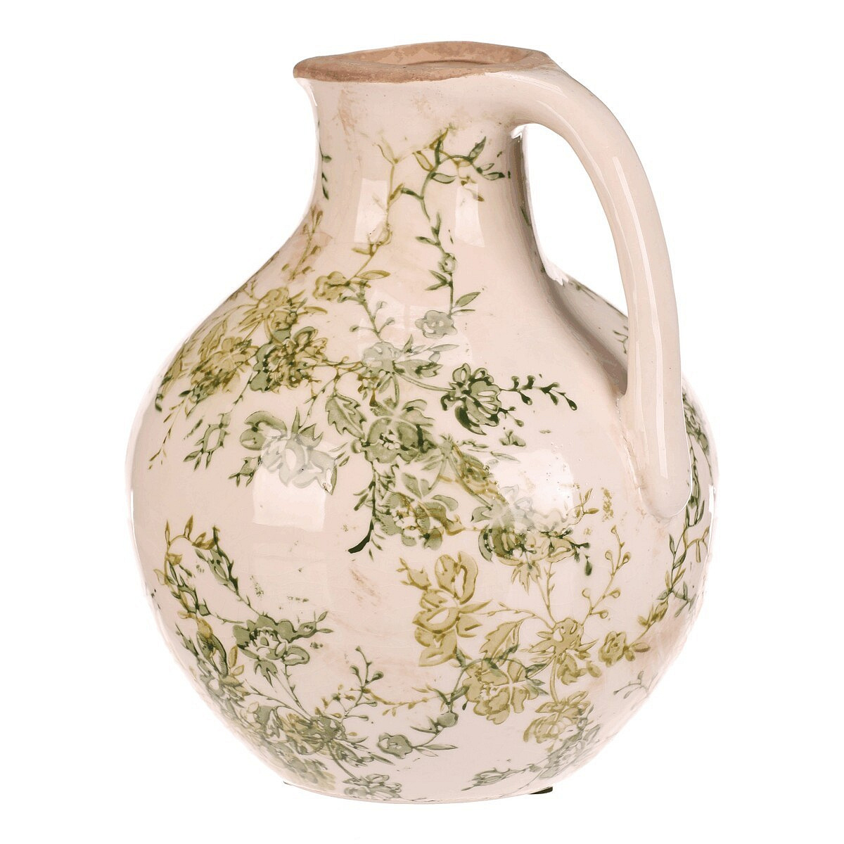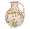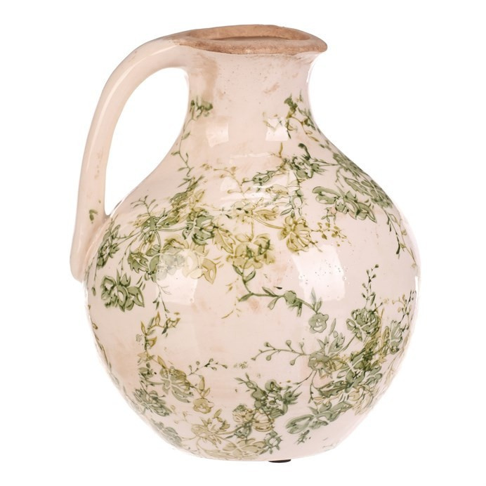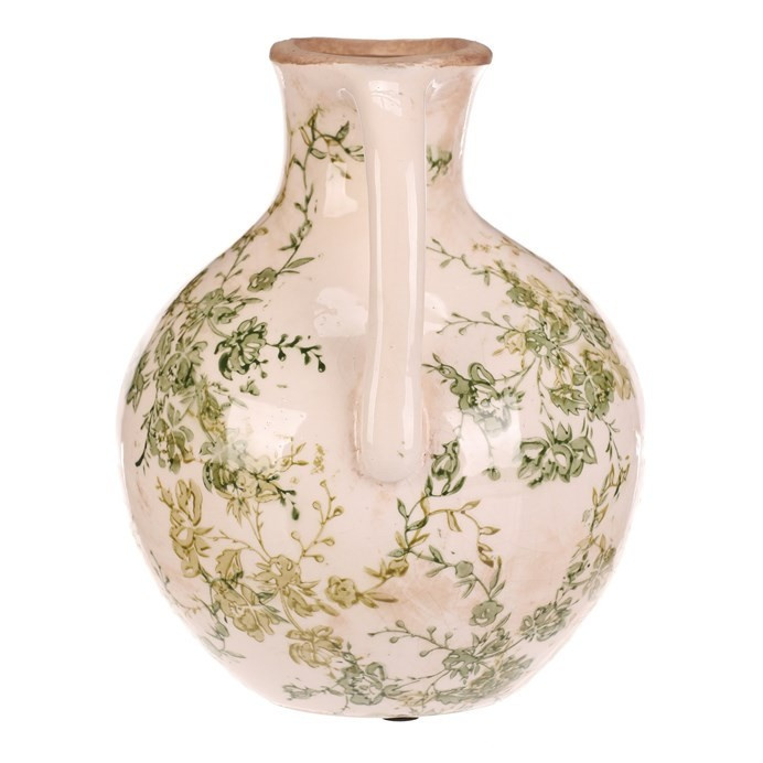 Keramická váza ve tvaru džbánku v retro stylu je zdobená jemným vzorem zelených květů na krémovém podkladu. Její zaoblený tvar s praktickým uchem umožňuje snadné přenášení a zároveň působí dekorativně. Povrch má jemný lesk, který podtrhuje vintage charakter výrobku. Váza střední velikosti je vhodná pro aranžmá sušených i čerstvých květin a vynikne jako samostatný dekorativní prvek v interiéru laděném do přírodních nebo rustikálních odstínů.