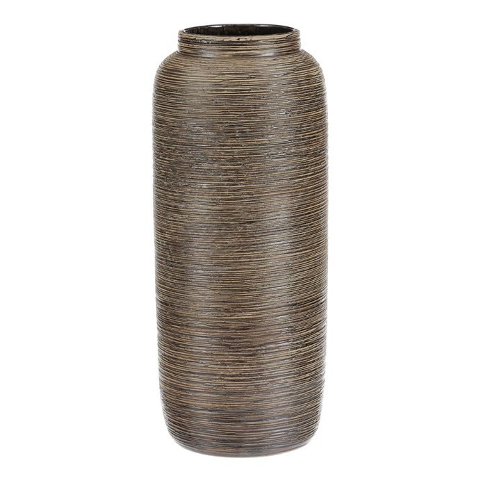 Keramická váza o výšce 40 cm zaujme jemně zaobleným tvarem, užším hrdlem a hnědým povrchem s vodorovnými rýhami, které jí dodávají starobylý vzhled. Jako by ji vyrobili samotní antičtí mistrové. Skvěle doplní váš interiér a nechá zasazené rostliny nádherně vyniknout.