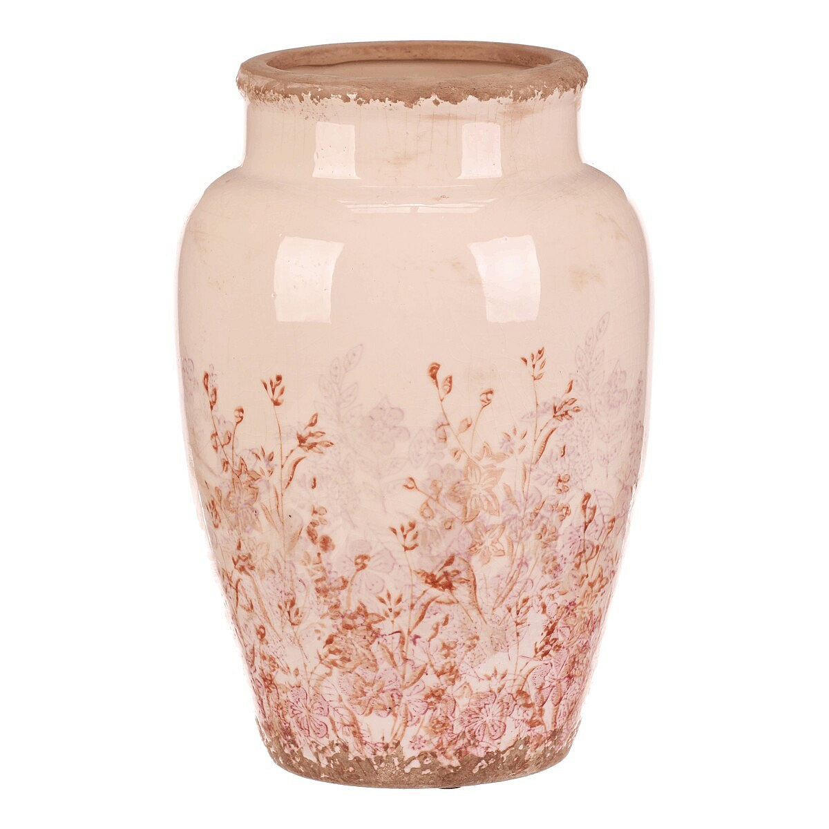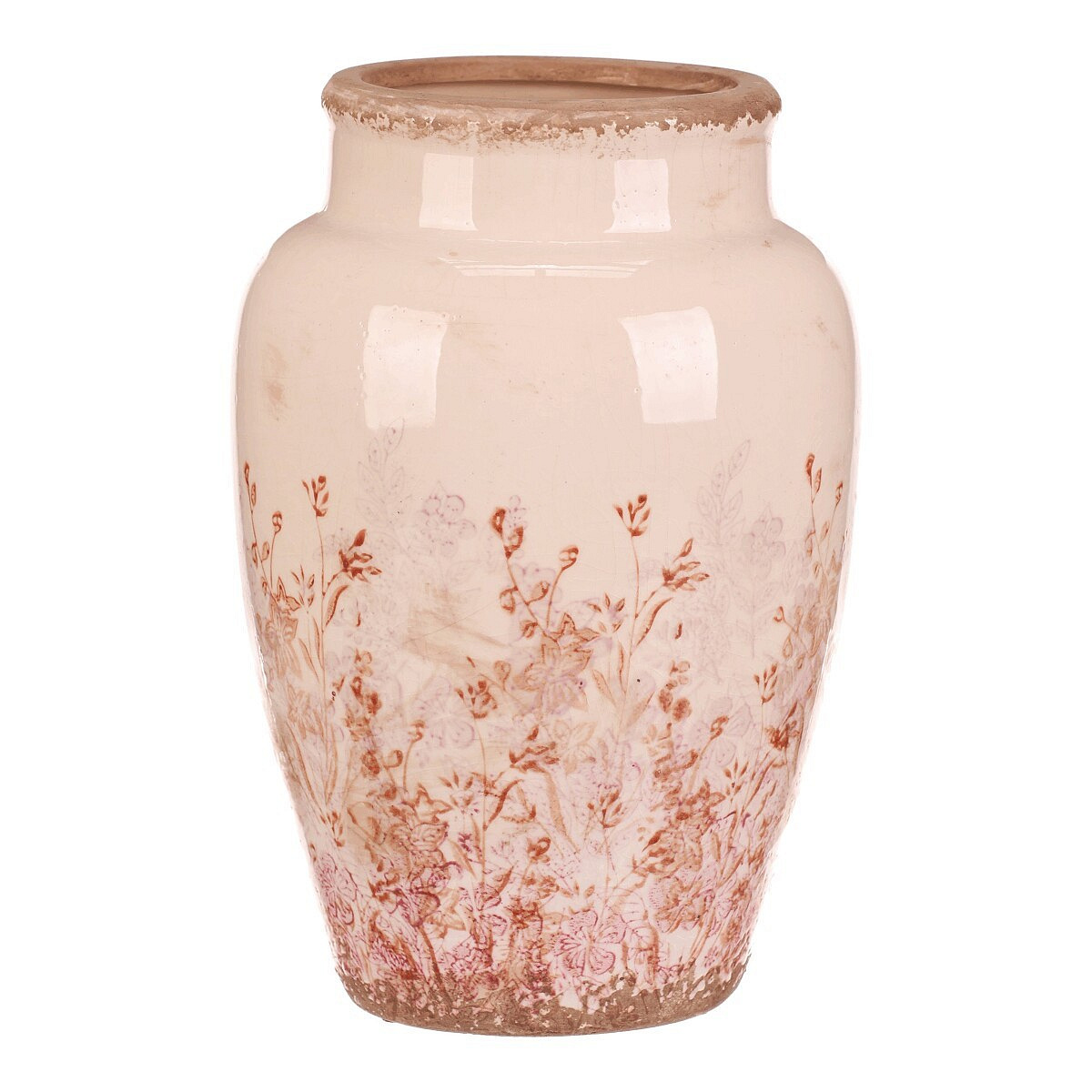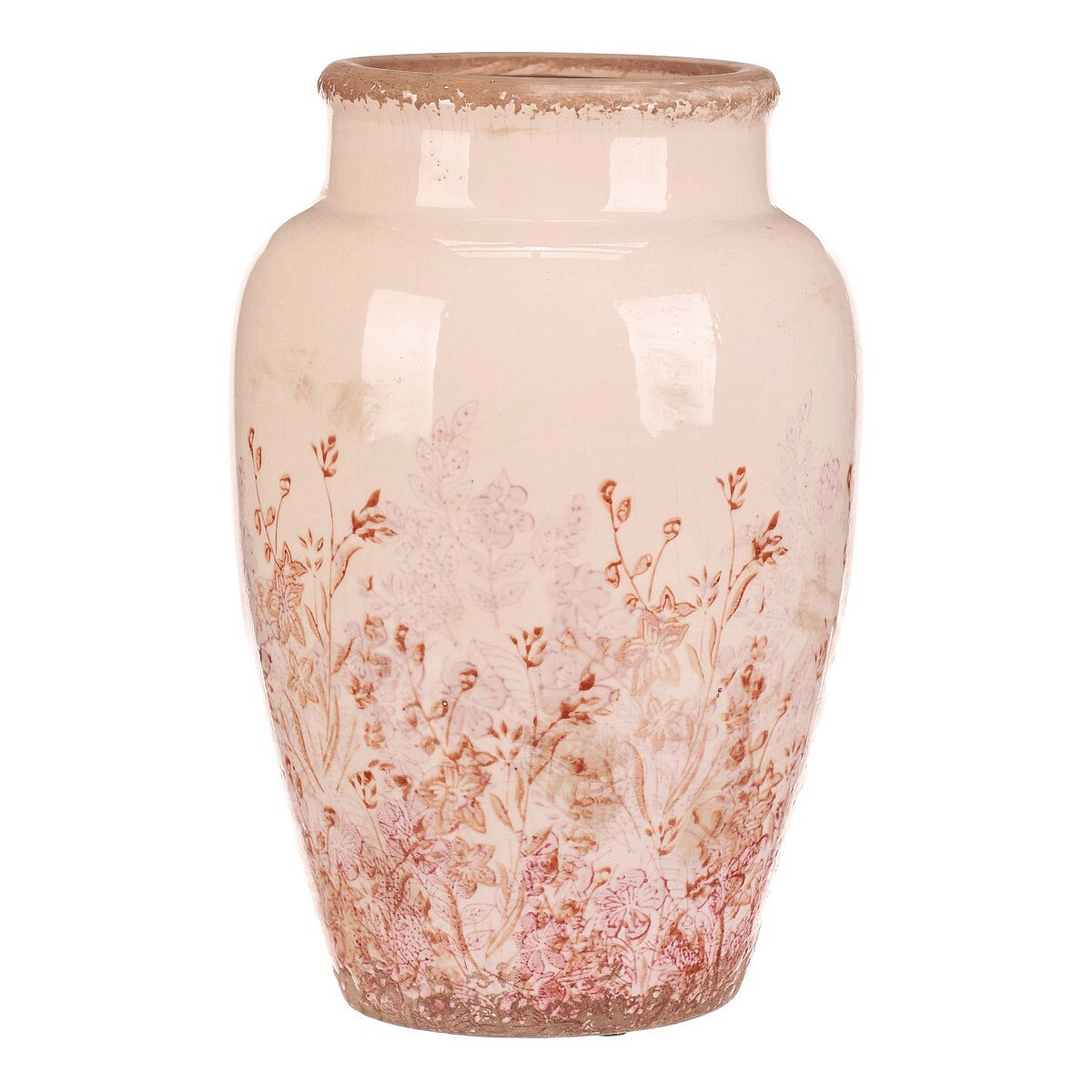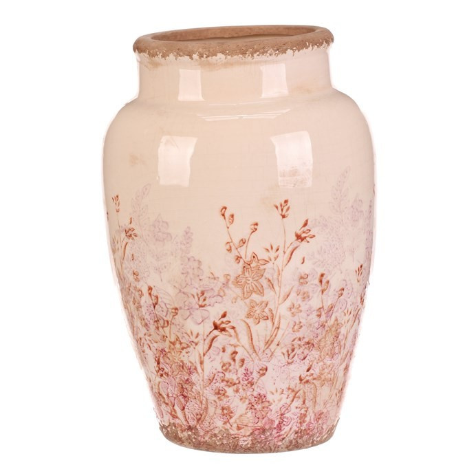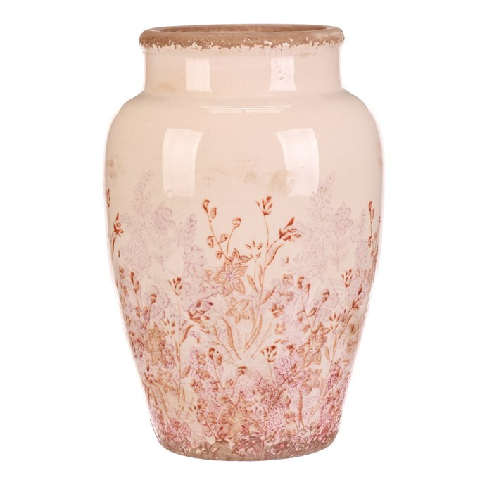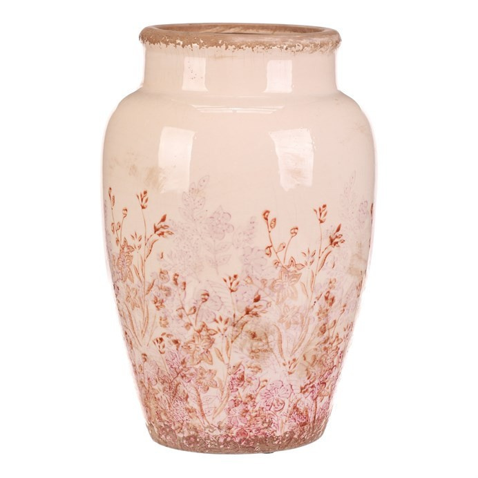 Keramická váza ve velikosti L zaujme svým zaobleným tvarem a jemným retro dekorem s růžovými květy, které působí přirozeně a vnášejí do prostoru příjemnou atmosféru. Povrch vázy je glazovaný s mírně patinovaným okrajem, což podtrhuje její vintage charakter. Váza je vhodná pro aranžmá čerstvých i sušených květin a díky svému rozměru se stane výrazným doplňkem interiéru. Stabilní základna zajišťuje pevné postavení na různých typech podkladů. Kombinace přírodních odstínů a květinového motivu umožňuje snadné sladění s různými styly dekorací.