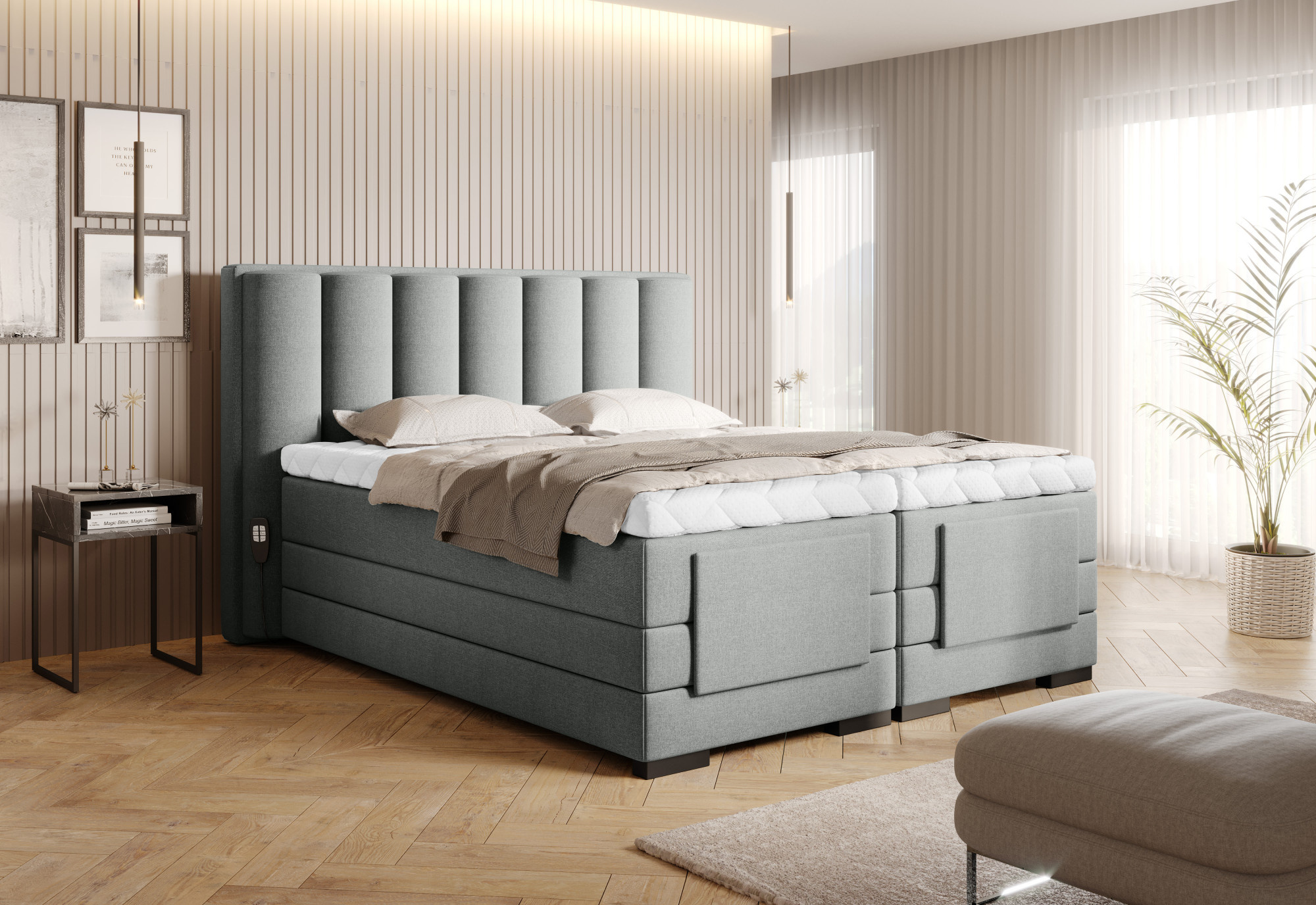 Nastaviteľná elektrická posteľ Veros vám umožňuje ovládať pohodlie vášho odpočinku, aby bol zaistený pohodlný a pokojný spánok. Má motorizovaný, nastaviteľný rám, ktorý používateľovi umožňuje ľahko nastaviť časti opierky nôh a opierky hlavy. Dokonca ani nemusíte vstávať z postele, aby ste zmenili jej polohu, pretože sada obsahuje dva diaľkové ovládače. V prípade jednolôžka je súčasťou jedno diaľkové ovládanie. Posteľ Veros sa skladá až z 2 hlavných matracov: bonellového a taštičkového, a vrchnej matrace. Hlavné matrace poskytujú maximálnu útulnosť a pohodlie, ktoré môže kontinentálna posteľ ponúknuť. Chránič matraca naopak dokonale chráni hlavné matrace pred nečistotami alebo poškodením. Výhody matracových topperov zahŕňajú aj skutočnosť, že poskytujú dodatočnú mäkkosť a oporu počas spánku a predlžujú životnosť hlavnej matrace. Matracový topper kontinentálnej postele Veros je zabezpečený odnímateľným poťahom z hodvábu, ktorý je možné prať v práčke. Elektrická posteľ Veros tiež vyzerá fantasticky a je skvelým doplnkom každej spálne. Čalúnené operadlo umožňuje umiestniť túto posteľ do stredu miestnosti, čím sa stane jej stredobodom. Čierna farba nôh je univerzálna a ľahko zapadne do mnohých rôznych usporiadaní spálne. Ďalšou výhodou, ktorá vám umožňuje vybrať si ideálnu posteľ Veros pre vašu spálňu, je skutočnosť, že sú k dispozícii až v 4 veľkostiach: 90/140/160/180 x 200 cm.