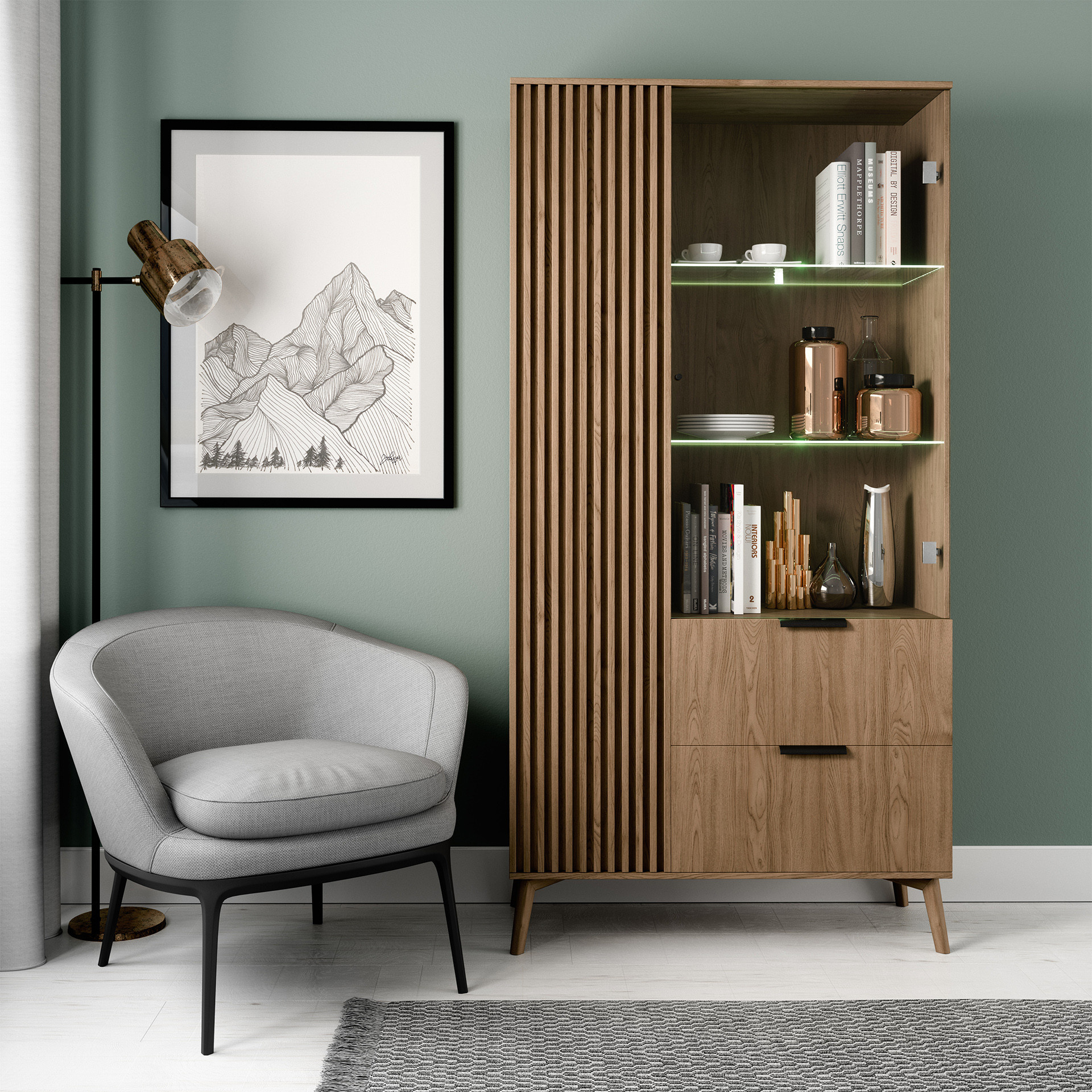 Táto vitrína je ideálnou voľbou pre obývacie izby, jedálne alebo kancelárie. Jej univerzálny dizajn a neutrálne farebné prevedenie umožňujú jednoduché začlenenie do rôznych štýlov interiérov, od moderných po klasické. Vitrína ENTSIAN 100 nielenže poskytuje praktické úložné riešenie, ale tiež pridáva do vášho domova nádych elegancie a sofistikovanosti.