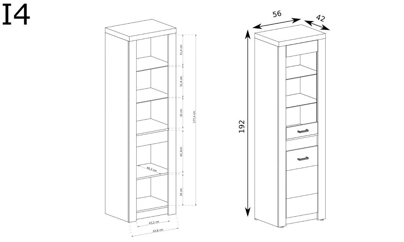 Vysoká vitrína s dvoma sklenenými policami a skrinkou v spodnej časti s jednou policou. Na výber je sklenené čelo a masívne čelo. K dispozícii je tiež možnosť LED osvetlenia hornej časti a políc. Ďalšie možnosti obohatia interiér. Zmestí sa do nej veľa oblečenia, doplnkov, kníh alebo dokumentov. Vitrína je ideálna na vystavenie ozdôb, porcelánu alebo suvenírov. Dostupné v troch farbách.