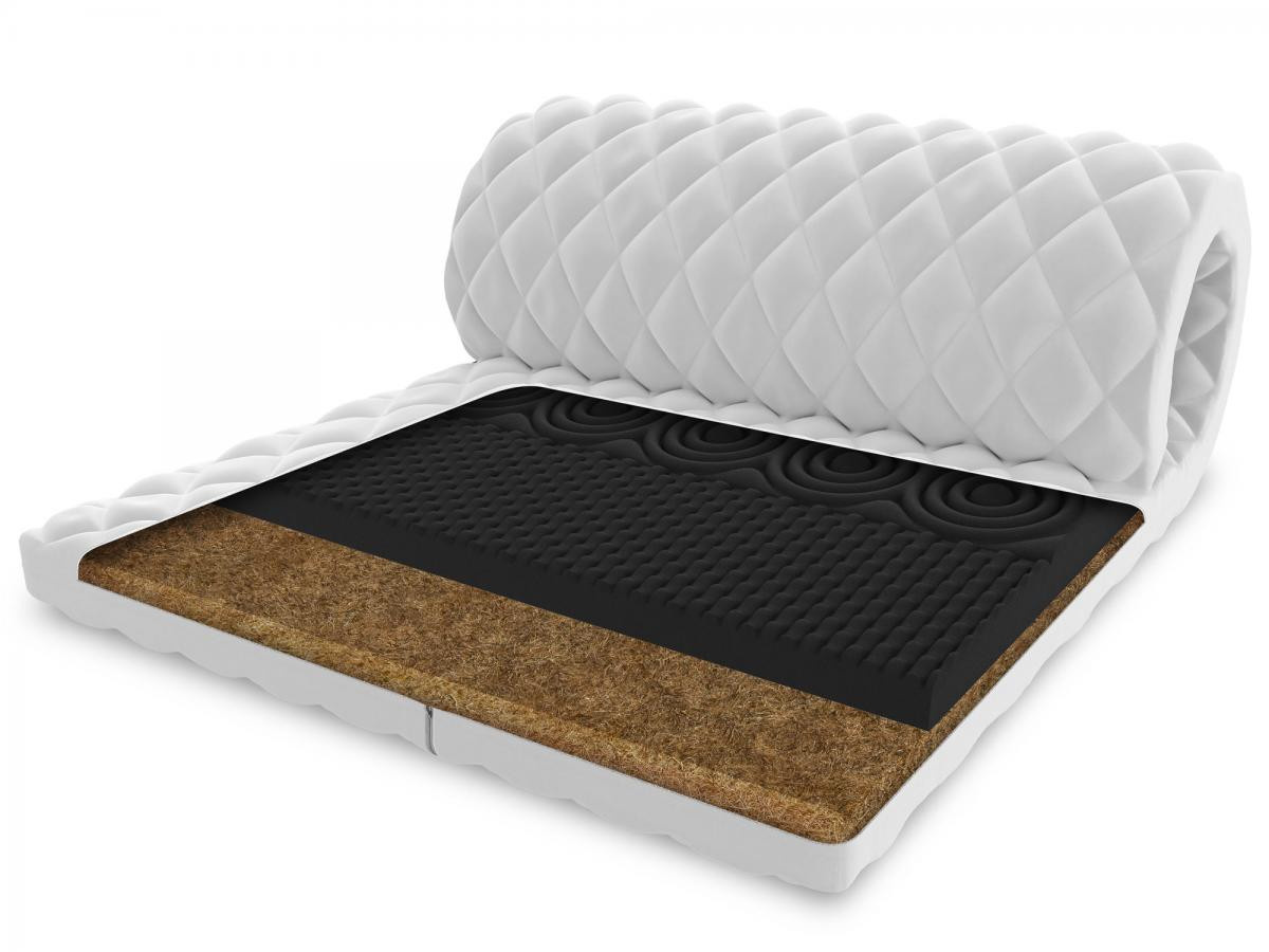 Štruktúra toppera: profilovaná 7-zónová vysoko odolná pena HR H30: profilovaný povrch rozdeľuje matrac na 7 zón, vďaka čomu sa pena dokonale prispôsobí tvaru tela. Má nerovnomernú bunkovú štruktúru, a preto dosahuje lepšie parametre pohodlia a pružnosti. Tento materiál sa vyznačuje mimoriadnou trvanlivosťou a odolnosťou voči deformácii. Okrem toho získava svoj pôvodný tvar dvakrát rýchlejšie ako štandardná polyuretánová pena. To znamená, že profilovaná pena HR rýchlejšie reaguje na zmeny polohy tela počas spánku. Druhá vrstva je vyrobená z latexovaného kokosu. Je to prírodná surovina, ktorá sa vyrába z vlákien kokosových škrupín s prídavkom latexu. Kokosové vlákna sú ľahké, vzdušné a odolné voči vlhkosti. Tvorí nepreniknuteľnú bariéru pre roztoče a všetky ostatné mikroorganizmy. Kokos nespôsobuje alergické reakcie a nedráždi dýchacie cesty. Znižuje tiež vylučovanie potu. Antialergický prešívaný poťah Premium 200 g/m² s membránovou štruktúrou je vyrobený z najlepších prémiových hypoalergénnych materiálov, ktoré zaručujú výnimočnú mäkkosť, sviežosť a výnimočné pohodlie a spokojnosť pri jeho používaní. Zabraňuje prenikaniu nečistôt do matraca, chráni pred prenikaním baktérií, húb, plesní a roztočov.Poťah je vybavený všitým zipsom, ktorý umožňuje jeho jednoduché vybratie na pranie. Výhody: pod vplyvom tlaku tela sa dokonale prispôsobí tvaru a siluete používateľa. Zmierňuje tlak v oblasti bedier a krku. Odnímateľný poťah - zapínanie na zips. Masážny efekt Špecifikácia: tvrdosť: H3 stredne tvrdá, hrúbka: 6 cm. Zloženie: HR pena H30: 4 cm, kokosové vlákno: 1 cm, termoplastická pena VISCO: 2 cm, poťah: 1 cm.