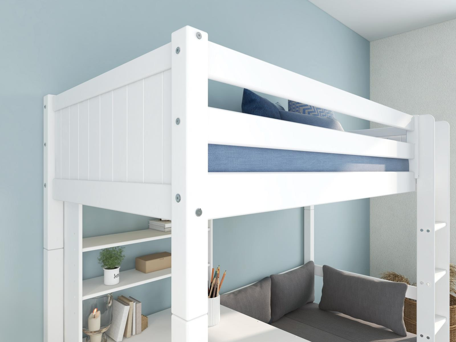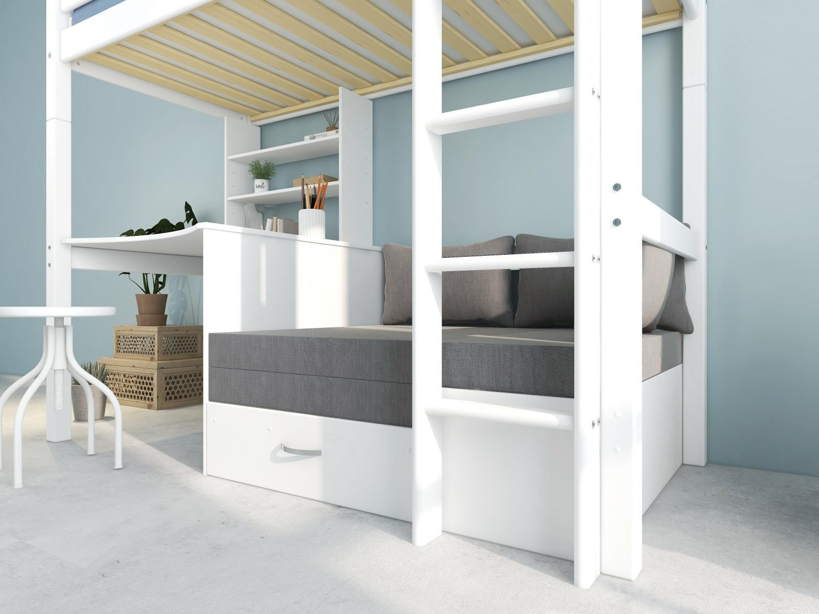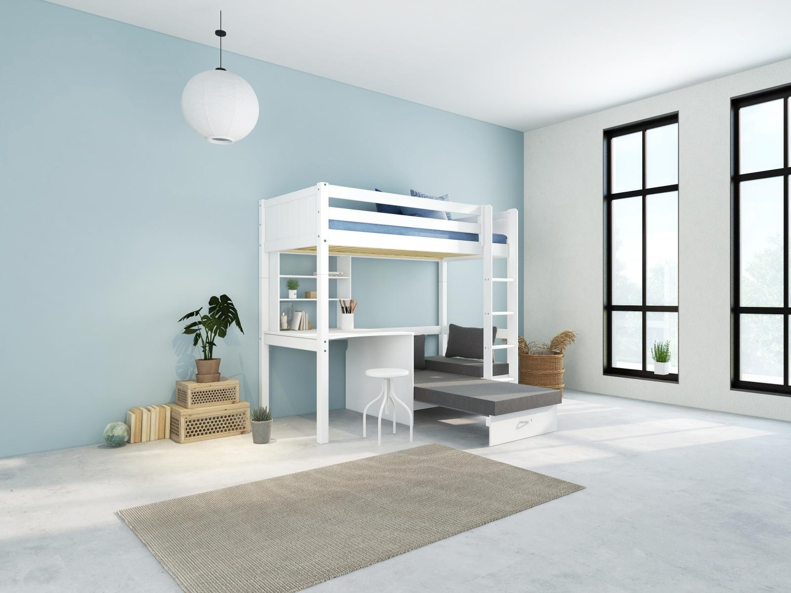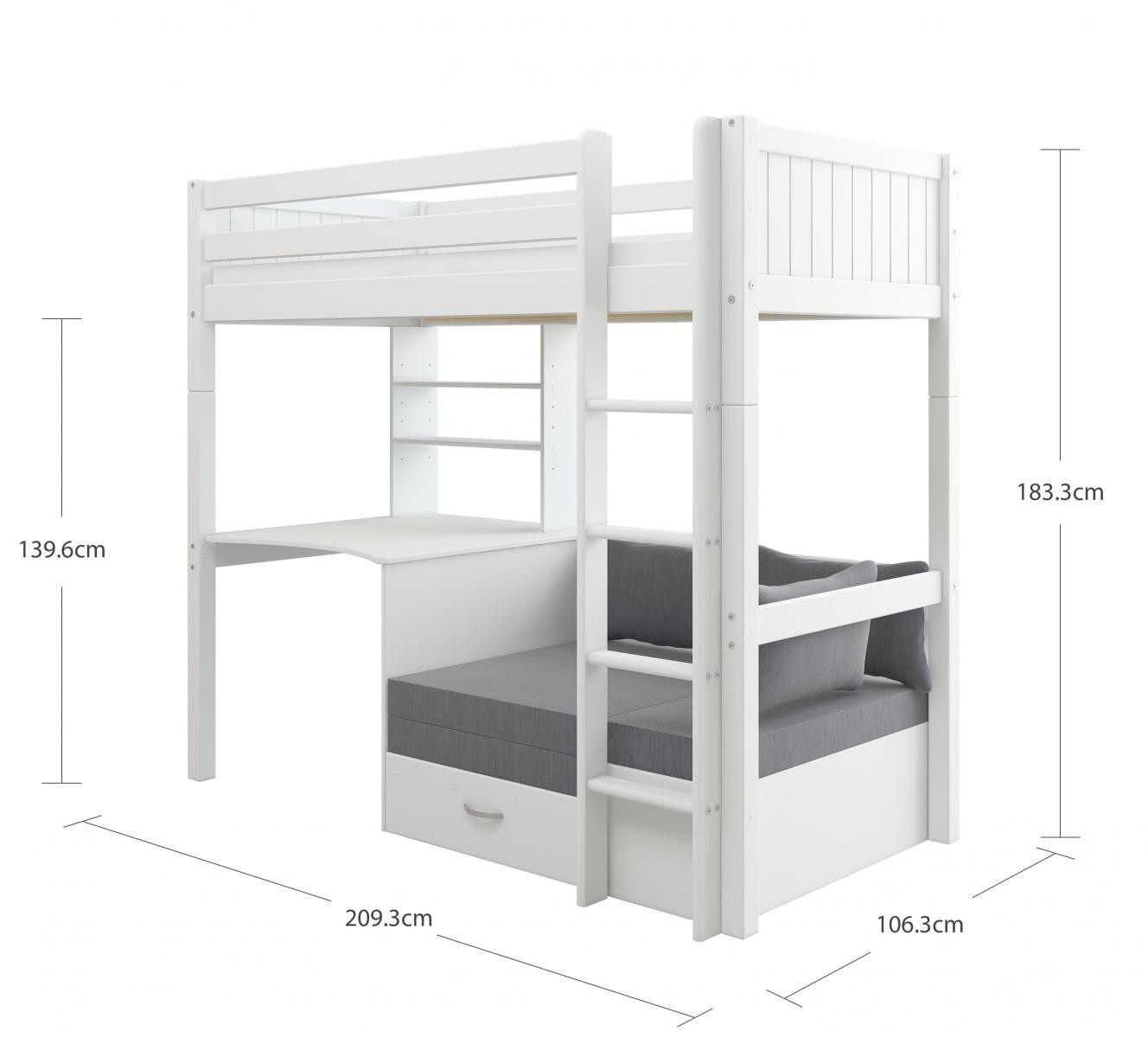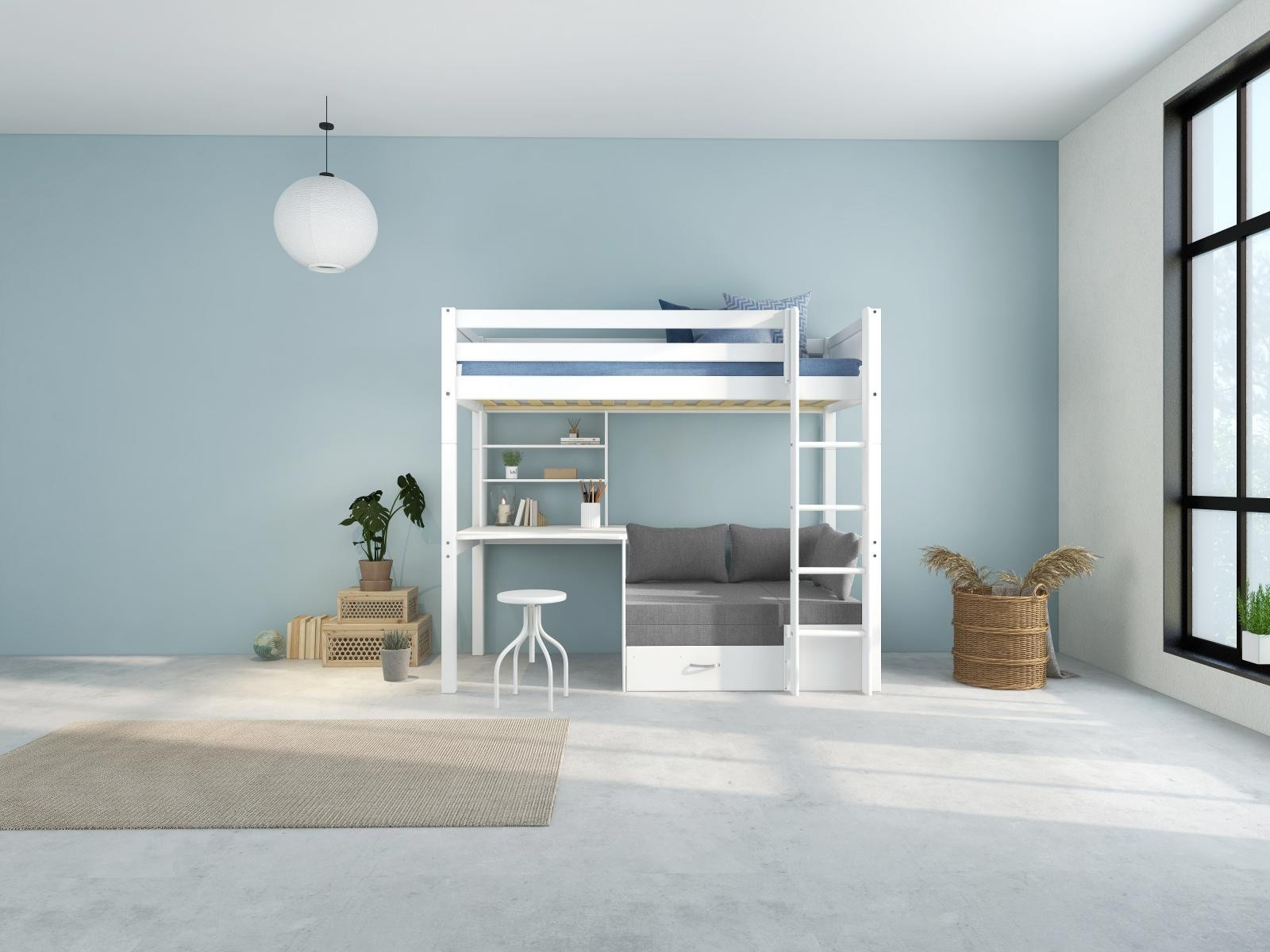 Vysoká posteľ s písacím stolom a rozkladacou pohovkou je fantastickým riešením pre efektívne využitie priestoru v izbe vášho tínedžera. Pod posteľou získate nielen dostatok miesta na štúdium či inú kreatívnu činnosť, ale aj útulnú pohovku na posedenie s priateľmi - ktorú je možné rozložiť na posteľ pre hostí.