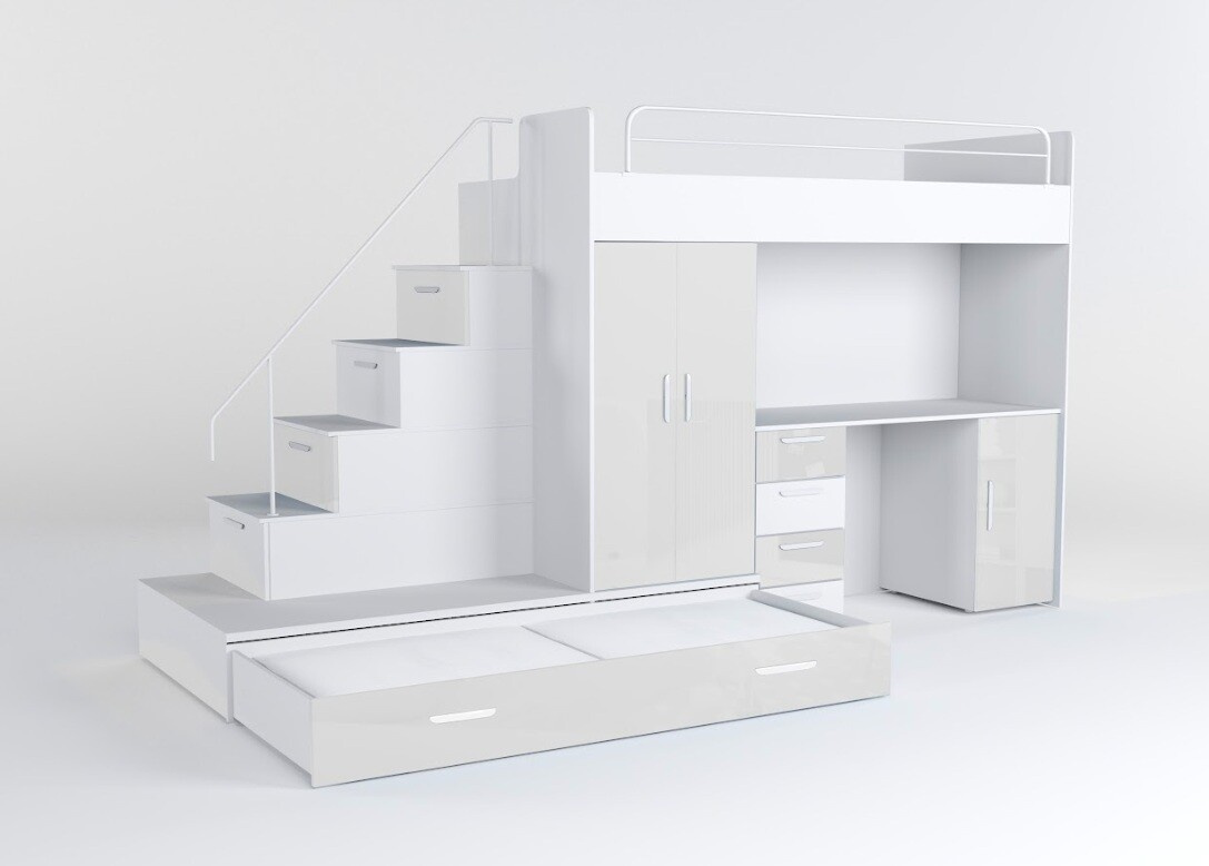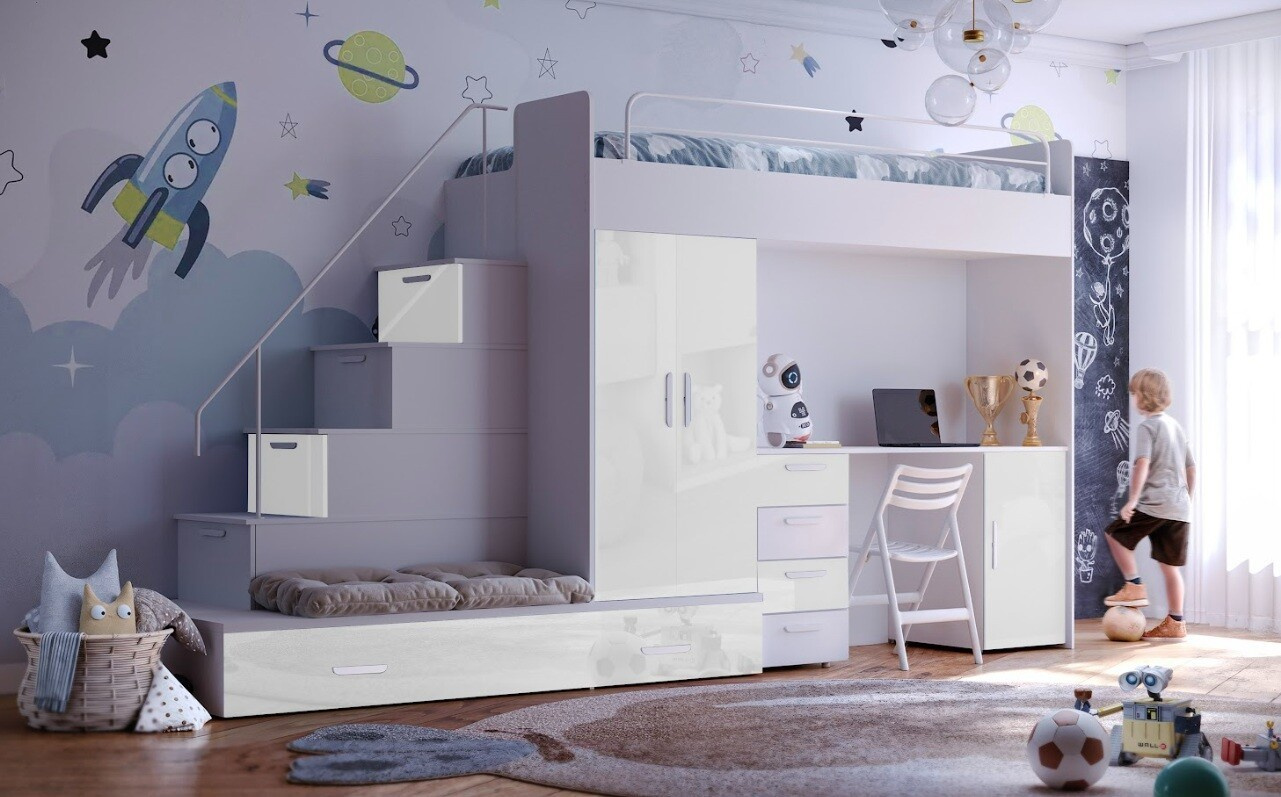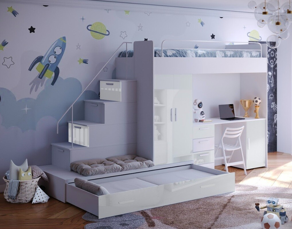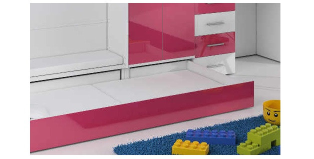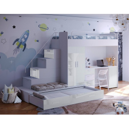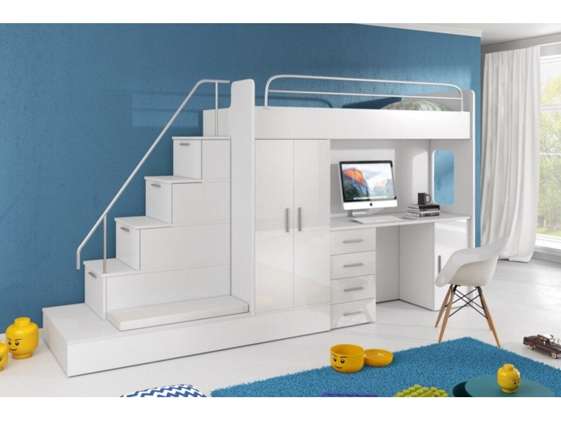 Táto posteľ je určená predovšetkým pre osoby, ktoré ocenia moderný dizajn, funkčnosť a množstvo úložných priestorov.Patentované prevedenie a stabilná konštrukcia postele Vám zaručuje bezpečie pre Vaše deti. Schody v sebe ukrývajú množstvo úložného priestoru. Farebné prevedenie dvierok je v lesku a schodíky je možné objednať ako na pravú, tak aj na ľavú stranu (stranu schodov určujeme z čelného pohľadu).Nosnosť lôžka je 100 kg, nosnosť schodu je 55 kg.Pod posteľou sa nachádza písací stôl so zásuvkami aj šatníková skriňa vrátane veľkej výsuvnej úložnej zásuvky. K tejto posteli je možnosť dokúpiť ďalší nábytok a vytvoriť tak krásnu detskú izbu. Uvedená úvodná fotografia je v ľavom prevedení.