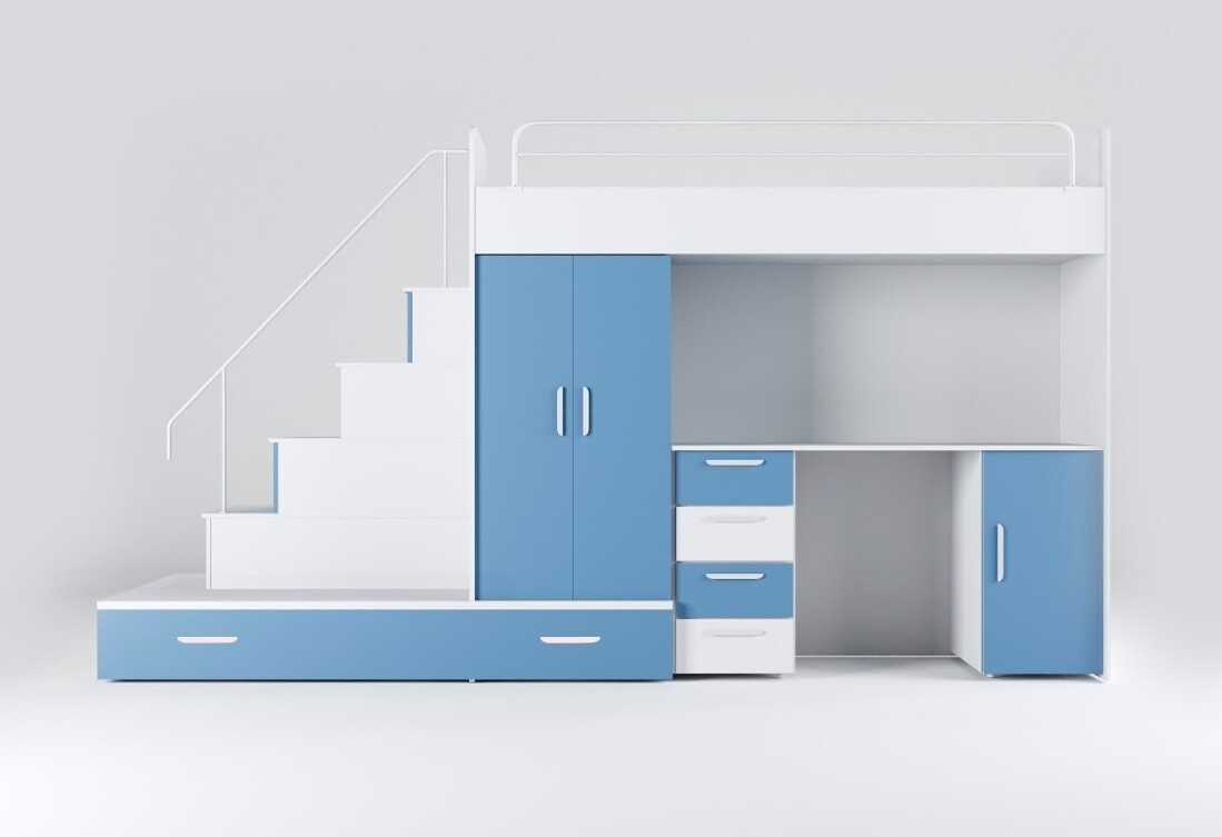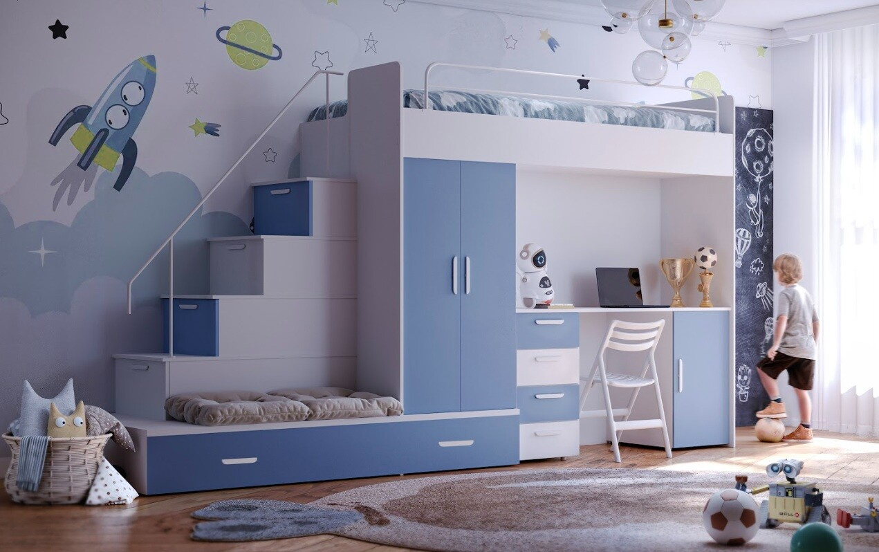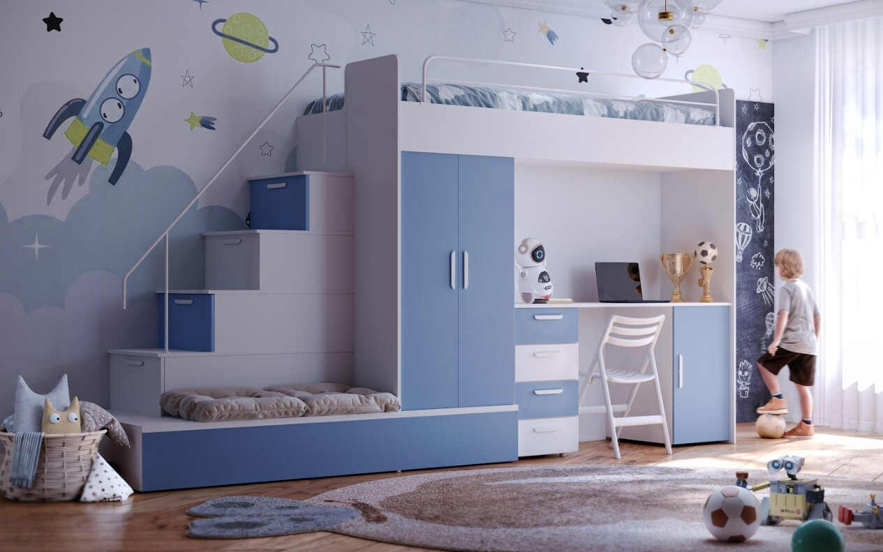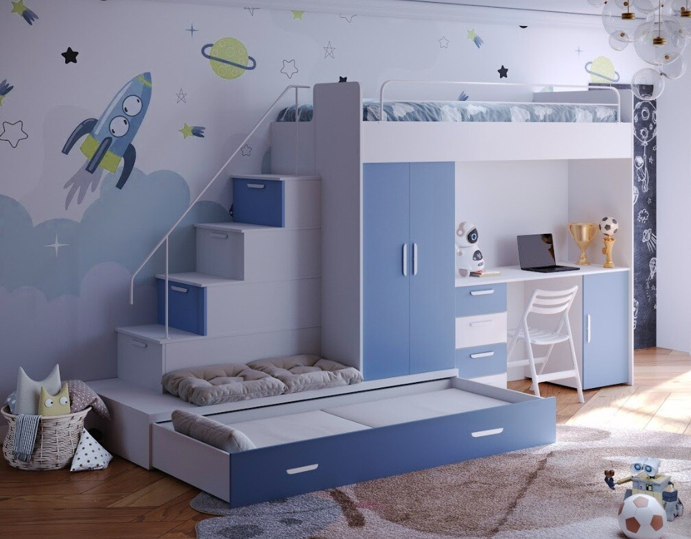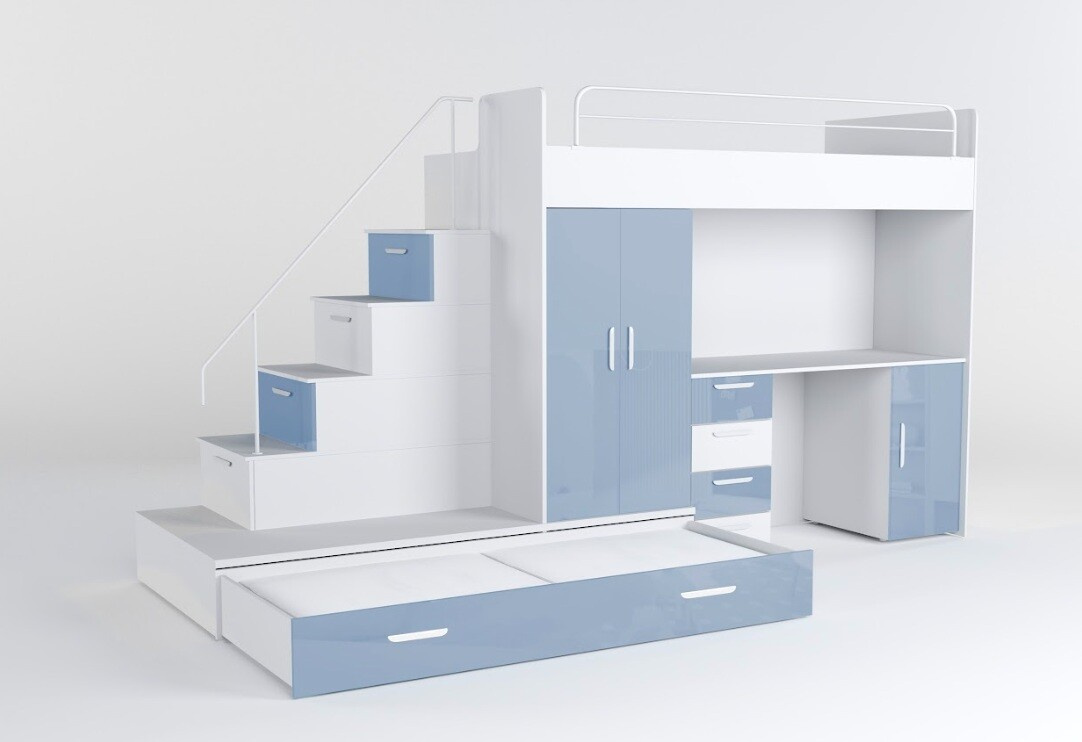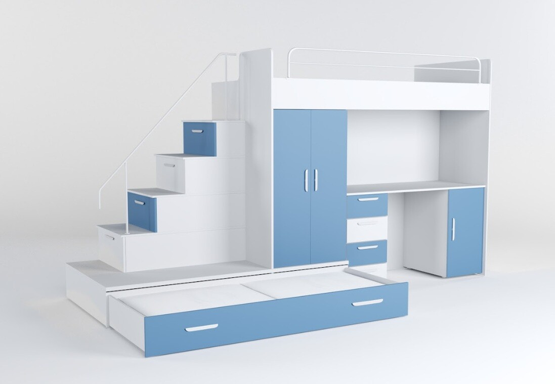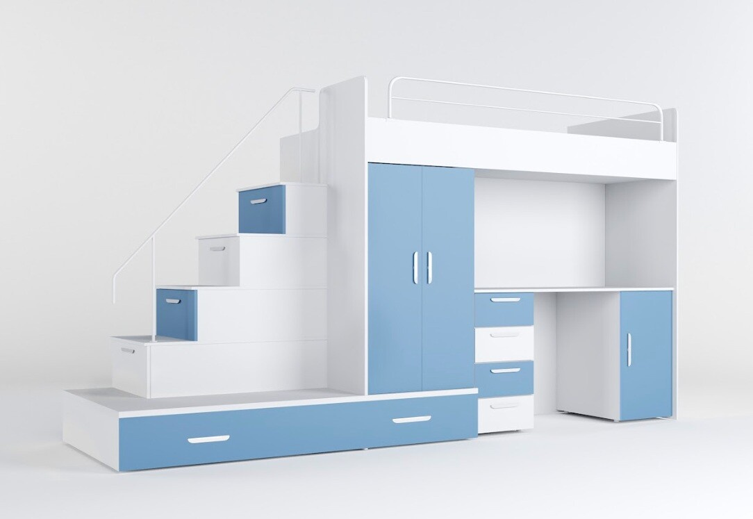 Vytvorte svojmu dieťaťu útulný a praktický priestor s našou multifunkčnou posteľou, ktorá ponúka nielen pohodlie, ale aj dostatok úložného priestoru a pracovnú plochu pre každodenné aktivity.