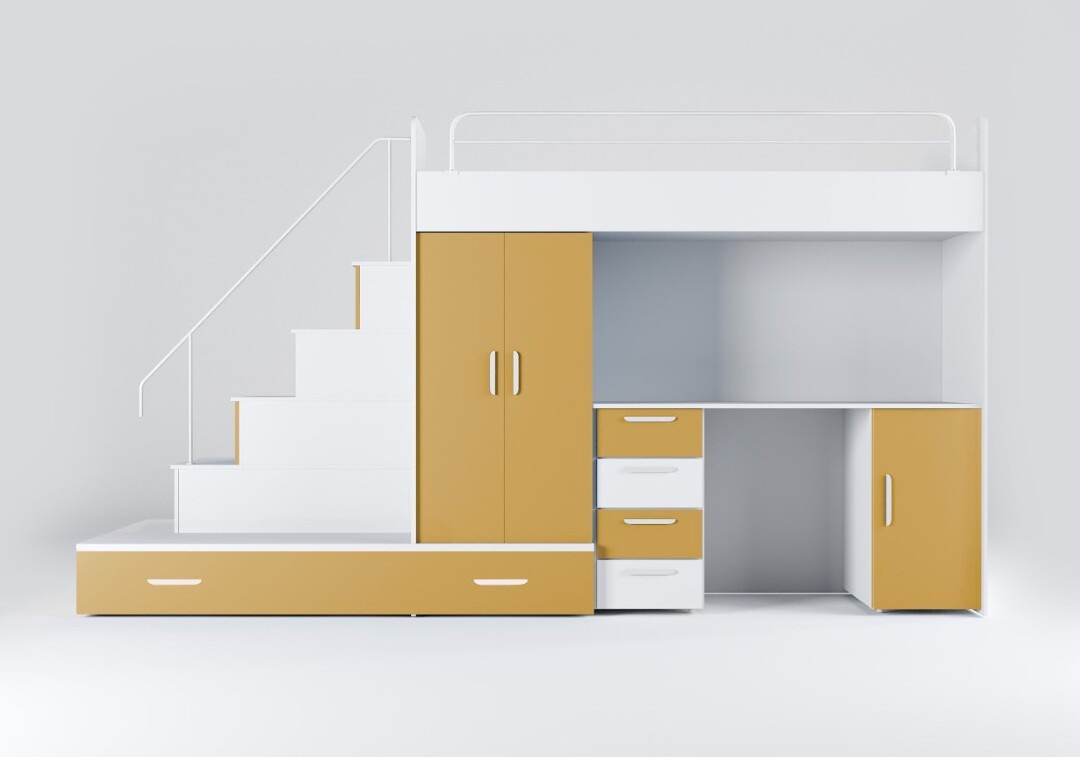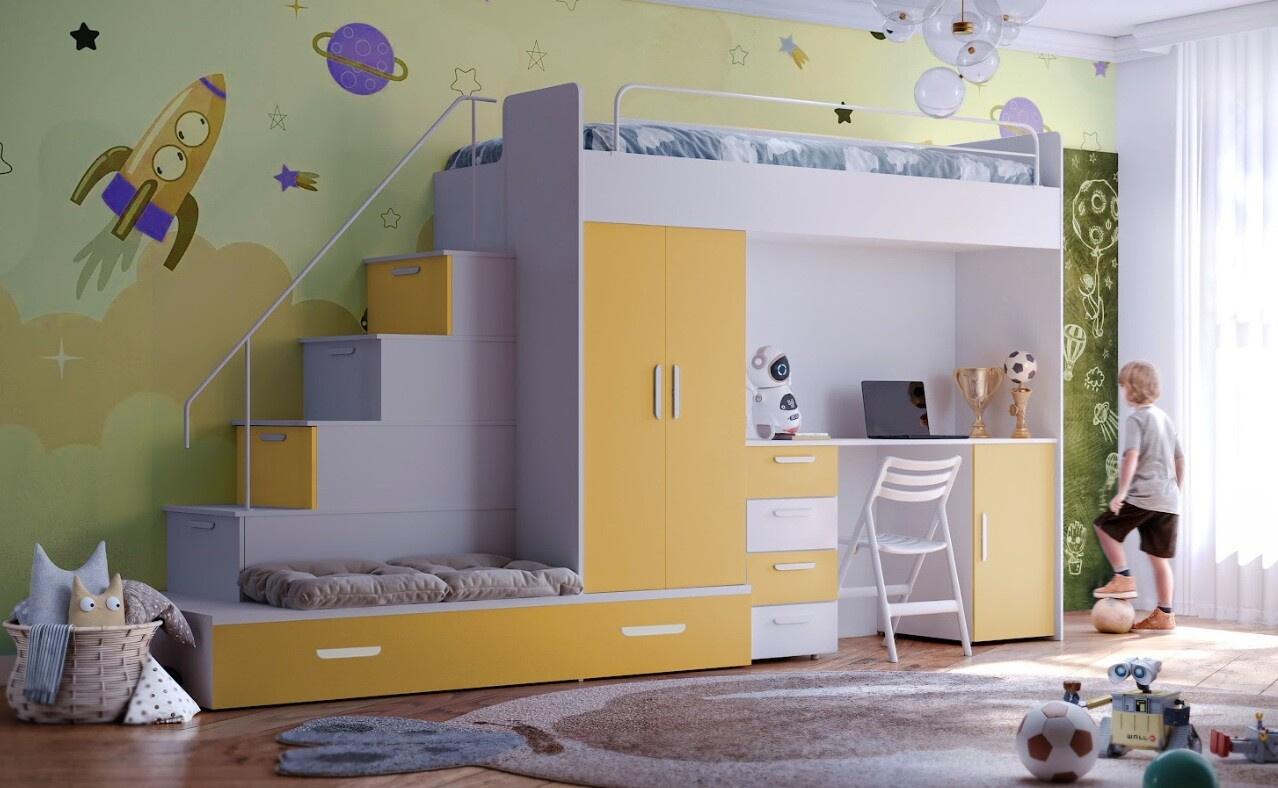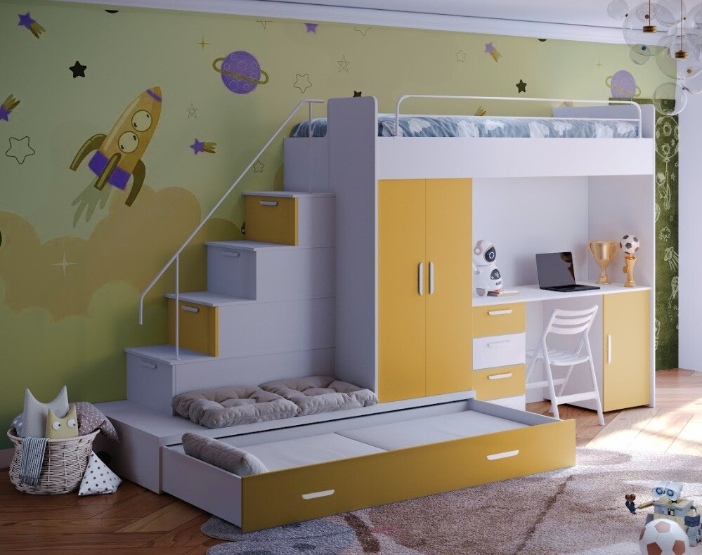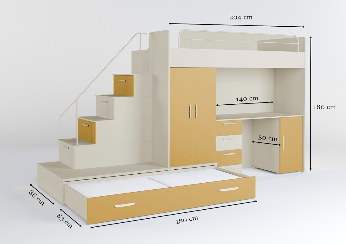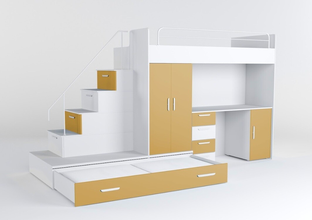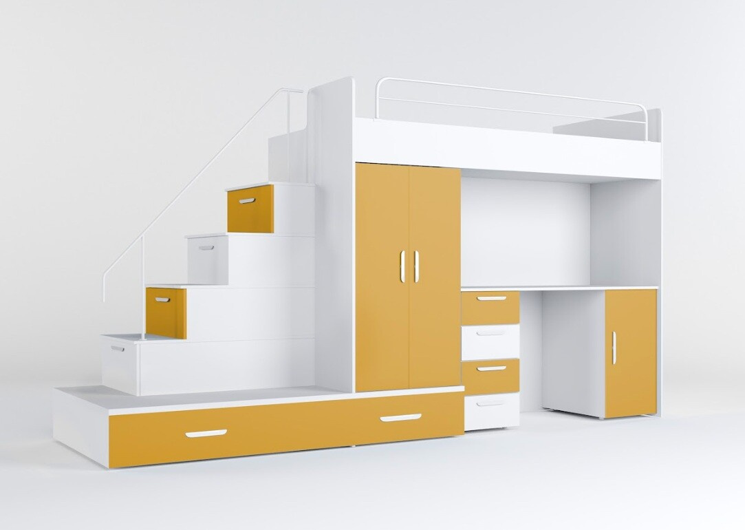 Vytvorte svojmu dieťaťu útulný a praktický priestor s našou multifunkčnou posteľou, ktorá ponúka nielen pohodlie, ale aj dostatok úložného priestoru a pracovnú plochu pre každodenné aktivity.