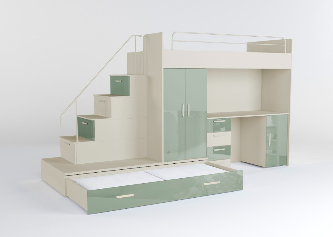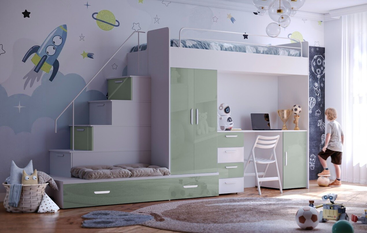 : Posteľ so schodíkmi vrátane políc, stola a úložných priestorov