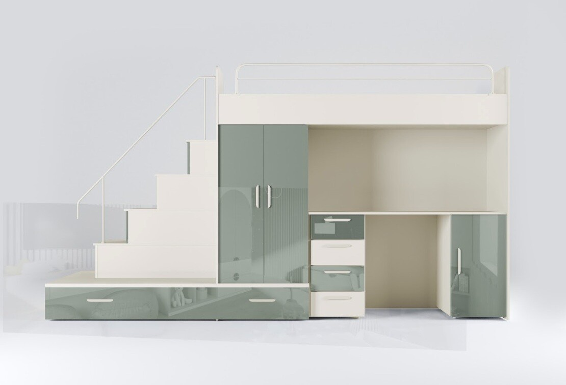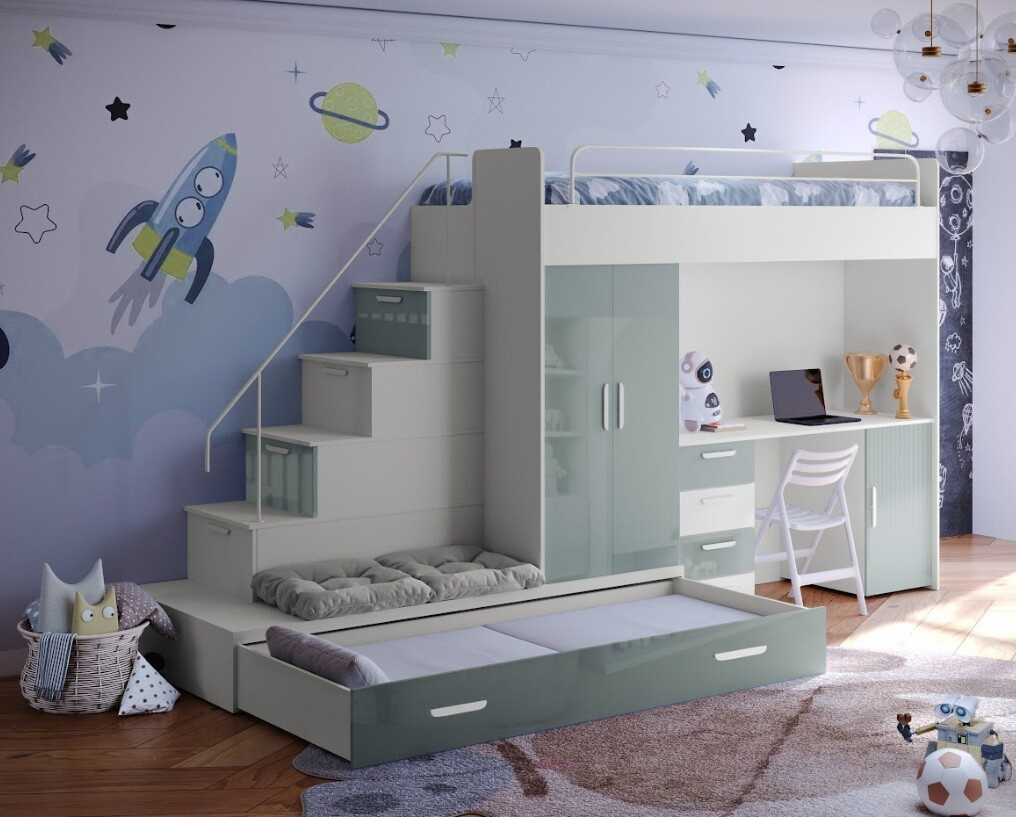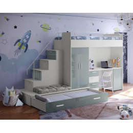 Táto posteľ je určená predovšetkým pre osoby, ktoré ocenia moderný dizajn, funkčnosť a množstvo úložných priestorov.Patentované prevedenie a stabilná konštrukcia postele Vám zaručuje bezpečie pre Vaše deti. Schody v sebe ukrývajú množstvo úložného priestoru. Farebné prevedenie dvierok je v lesku a schodíky je možné objednať ako na pravú, tak aj na ľavú stranu (stranu schodov určujeme z čelného pohľadu).Nosnosť lôžka je 100 kg, nosnosť schodu je 55 kg.Pod posteľou sa nachádza písací stôl so zásuvkami aj šatníková skriňa vrátane veľkej výsuvnej úložnej zásuvky. K tejto posteli je možnosť dokúpiť ďalší nábytok a vytvoriť tak krásnu detskú izbu. Uvedená úvodná fotografia je v ľavom prevedení.