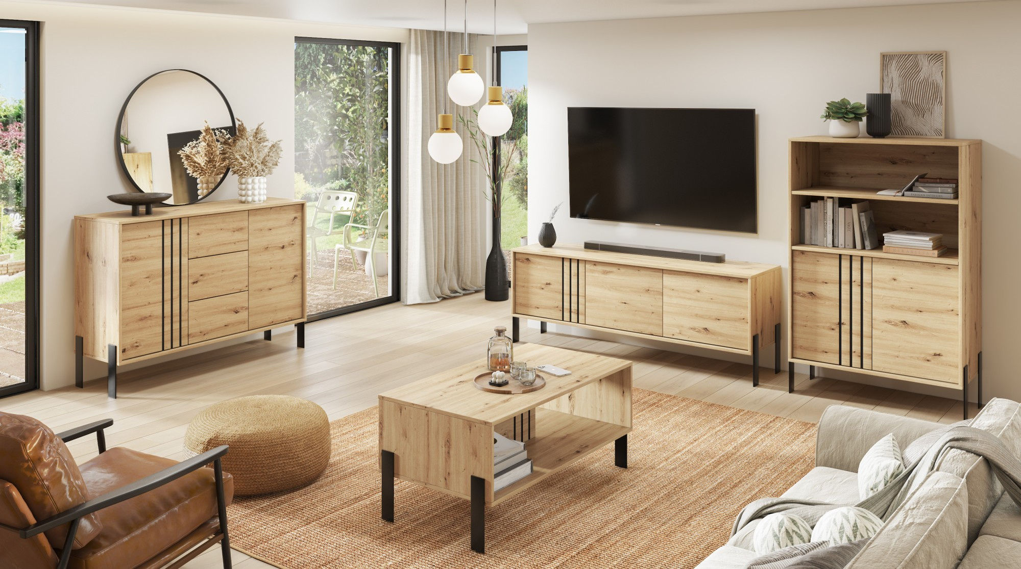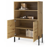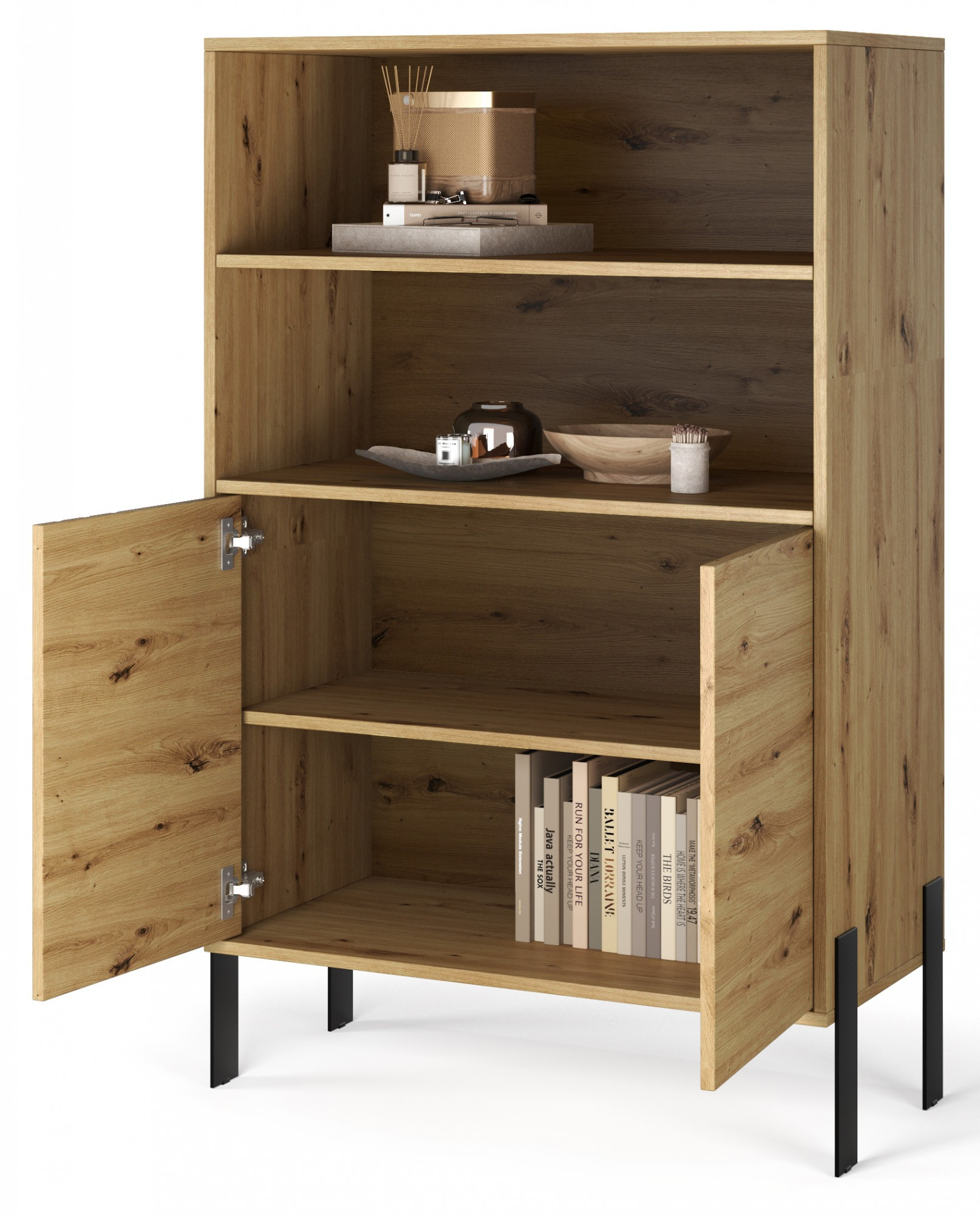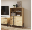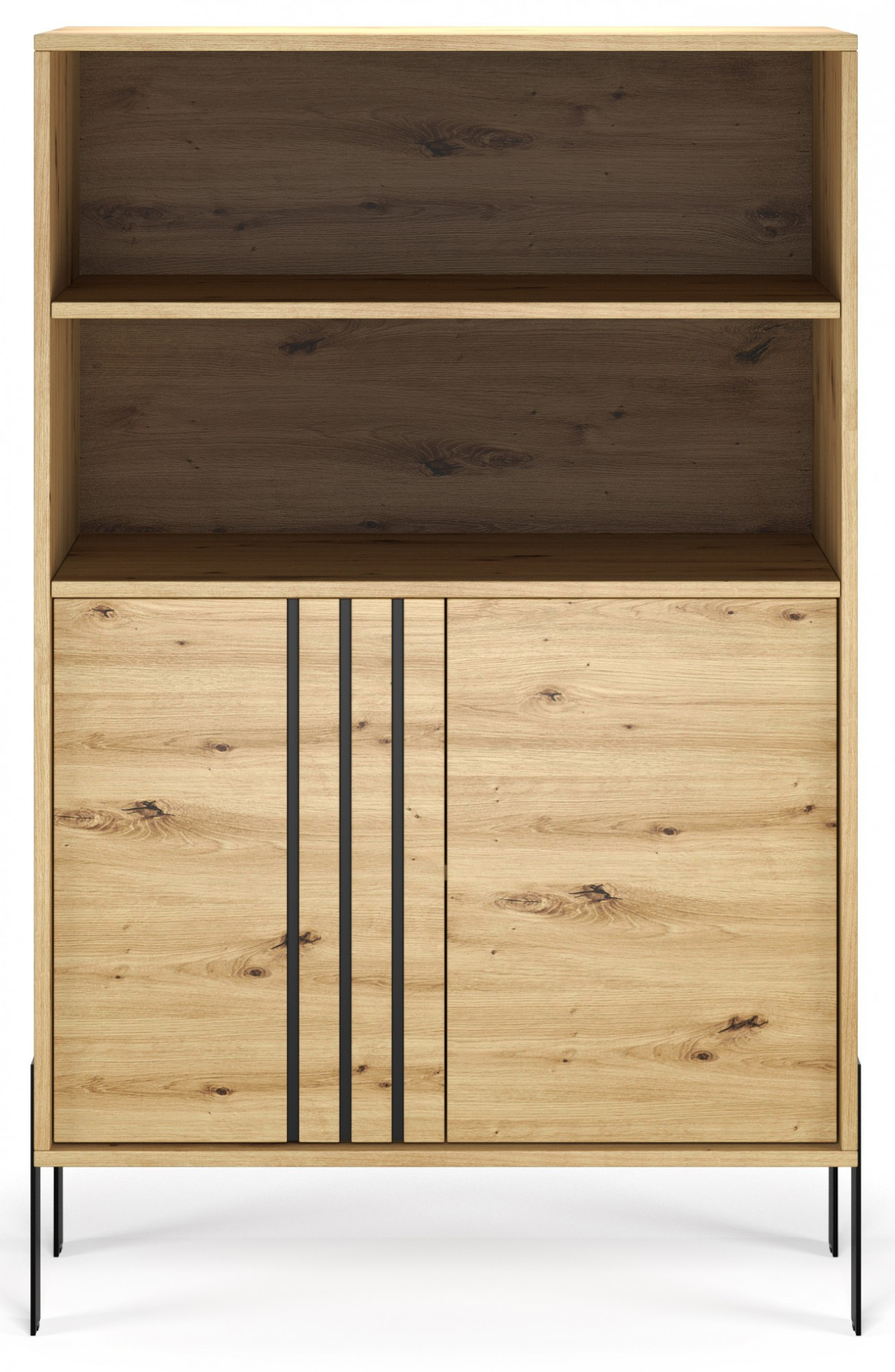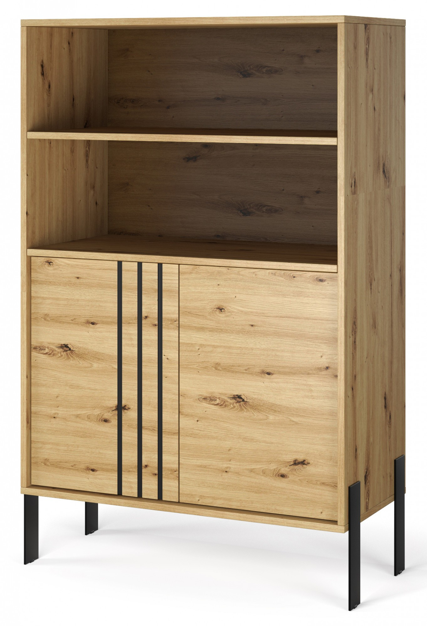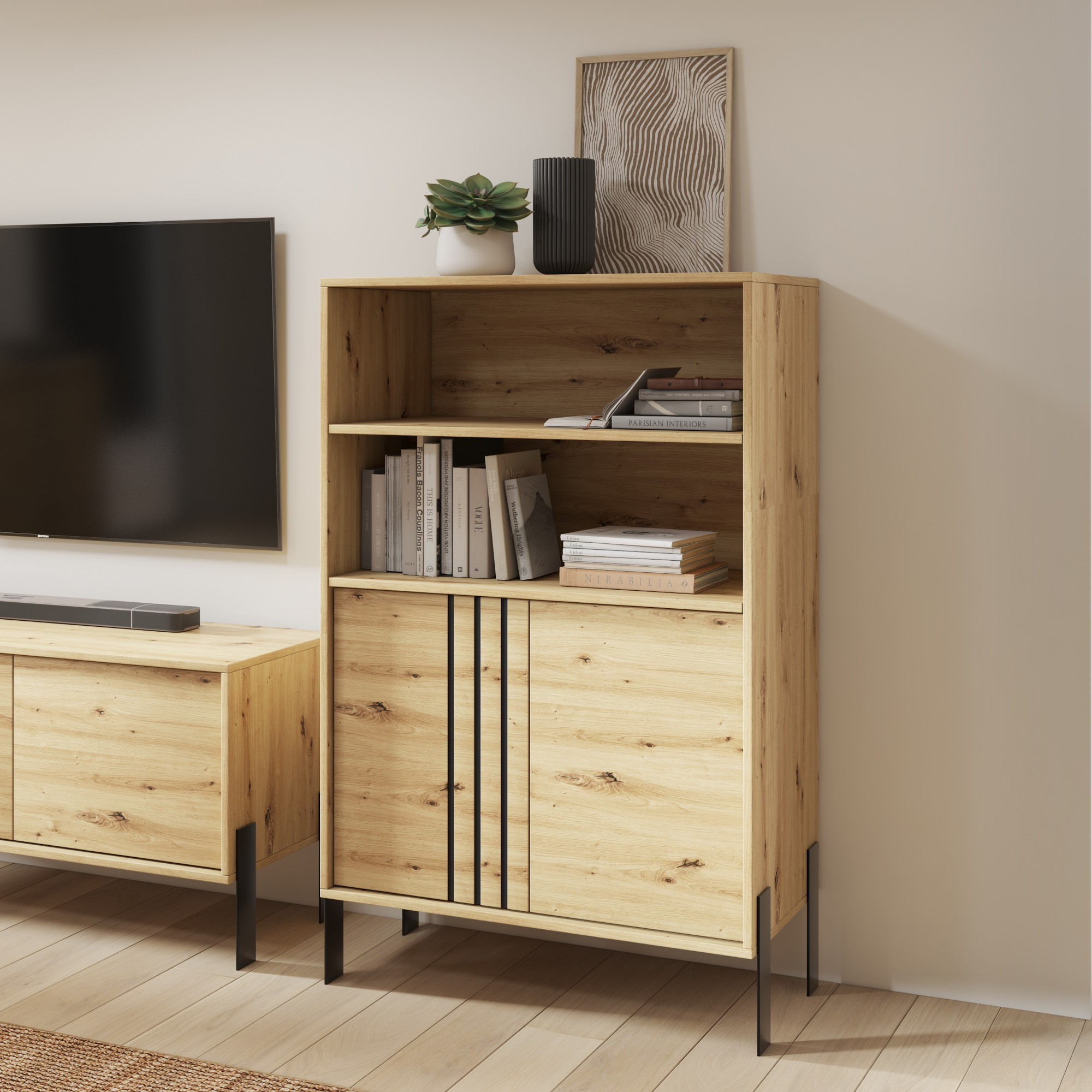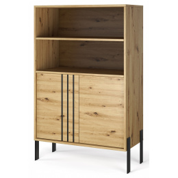 Witryna **Nexo** to elegancki i funkcjonalny mebel, który doskonale sprawdzi się w salonie, jadalni lub gabinecie. Jej nowoczesna forma oraz subtelne detale dekoracyjne sprawiają, że idealnie wpisuje się w współczesne aranżacje wnętrz, dodając im stylu i lekkości. Model dostępny jest w dwóch modnych wariantach kolorystycznych: **Artisan**, inspirowanym naturalną strukturą drewna, oraz **Kaszmir**, który wprowadza do wnętrza elegancję i nowoczesną, stonowaną kolorystykę. Charakterystycznym elementem kolekcji są czarne, dekoracyjne listwy na froncie oraz **metalowe nogi**, które podkreślają nowoczesny charakter mebla i nadają mu wizualnej lekkości.