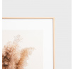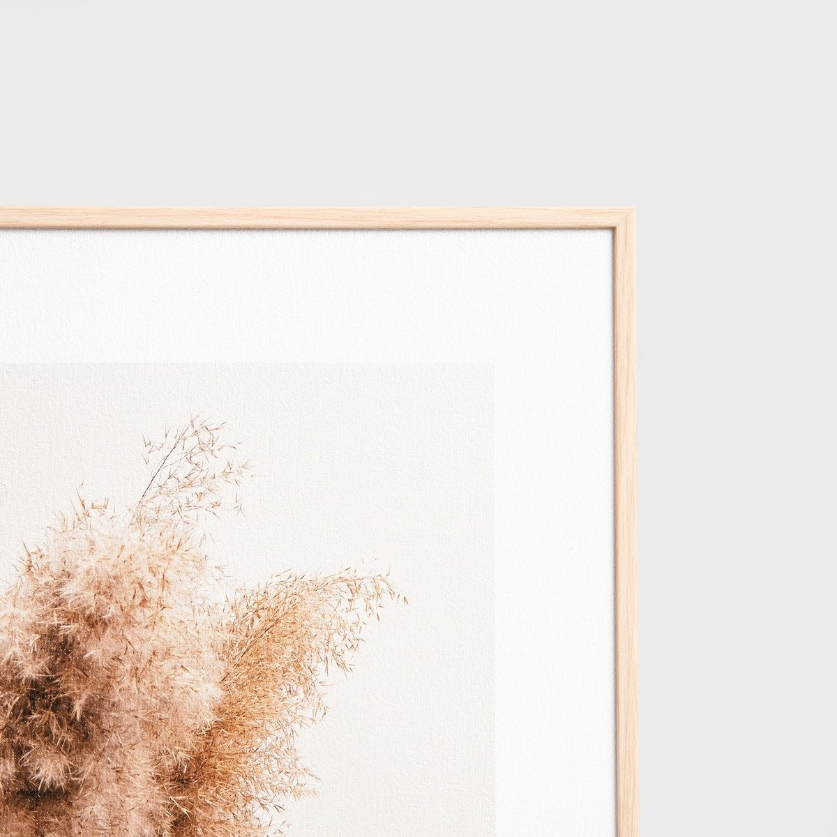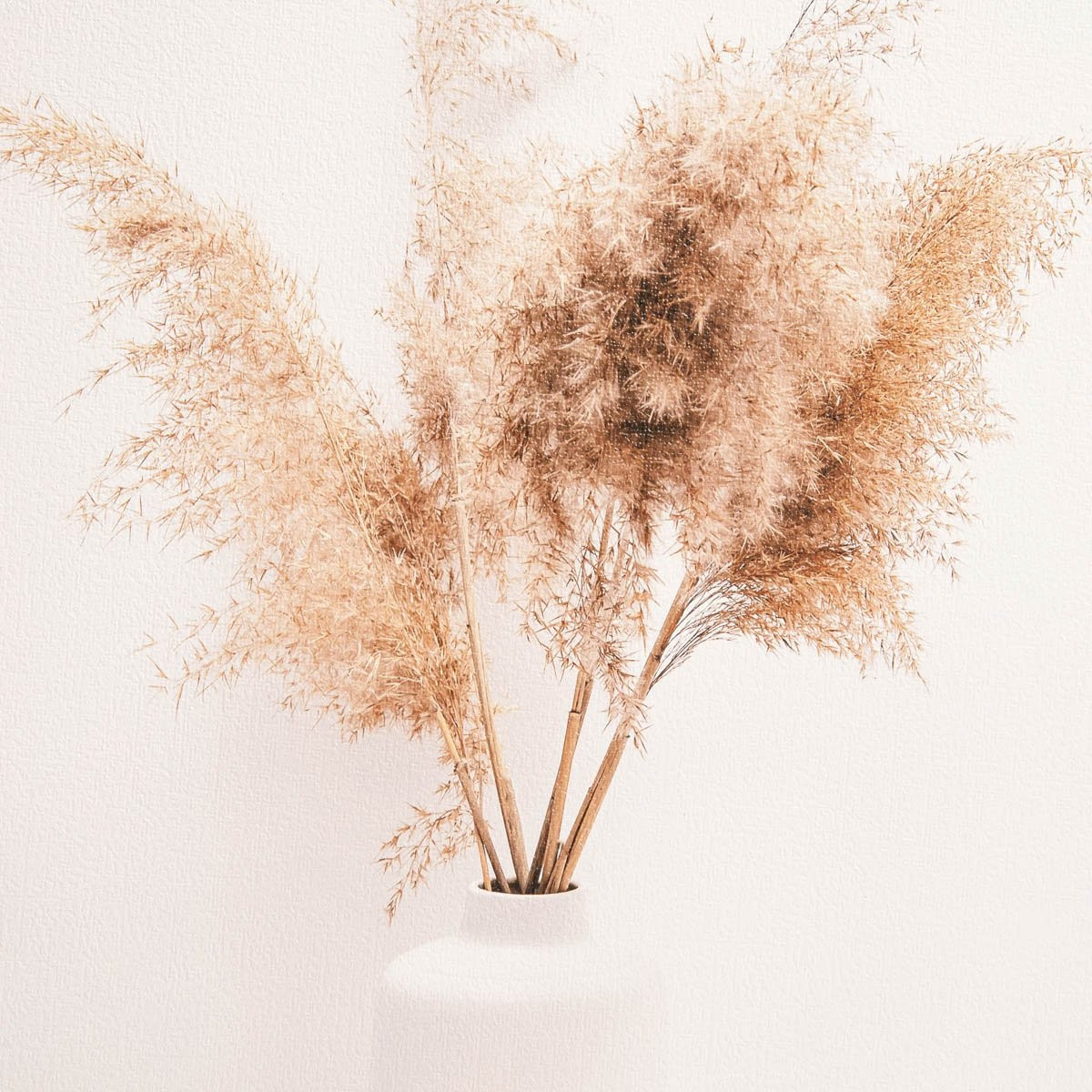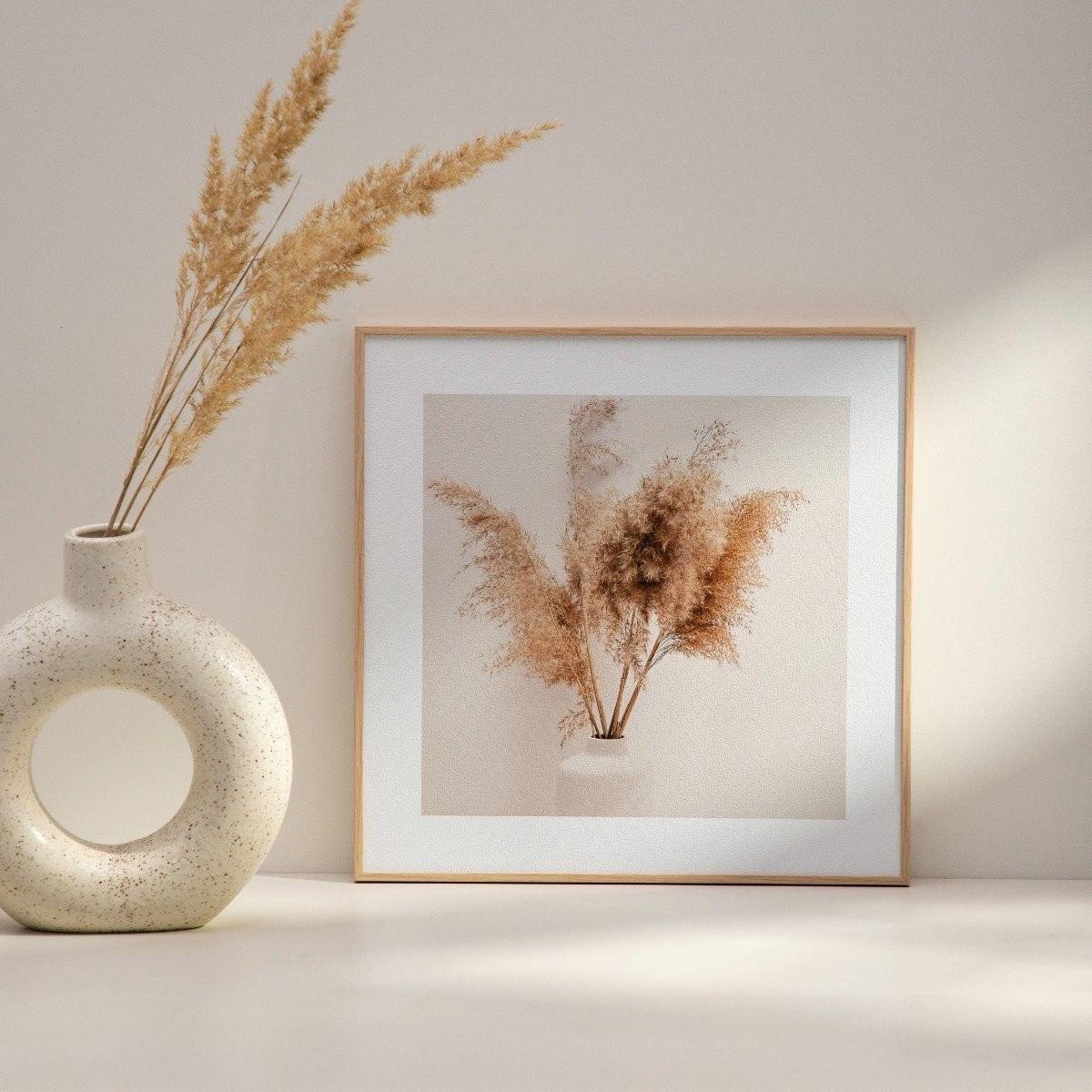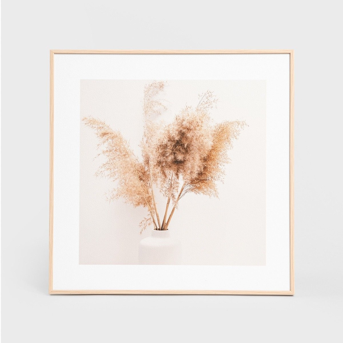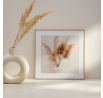 Obraz zobrazuje sušené kytice vo váze na bielom pozadí. Je zasadený do jemného dreveného rámu, ktorý dokonale ladí s prírodnou farebnou paletou obrazu.