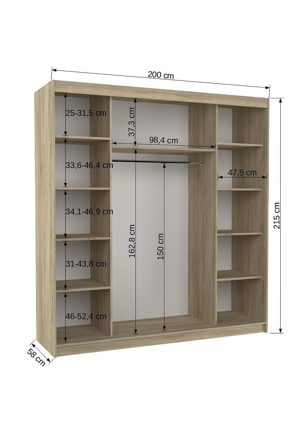 Šatní skriňa s posuvnými dverami OLIVER je ideálnym spôsobom, ako usporiadať priestor. Nábytok je vybavený priestrannými policami a tyčou, na ktorú môžete zavesiť šaty, obleky, vrchné odevy alebo košele. Na čelnej strane sa nachádza zrkadlo a charakteristické vodorovné pruhy v striebornej farbe, ktoré nábytku dodávajú výnimočný štýl. Vďaka tomu, že skriňa je posuvná, nemusíte vyčleňovať ďalšie miesto na otvorenie dverí, čo z nej robí ideálne riešenie pre malú izbu alebo úzku predsieň.